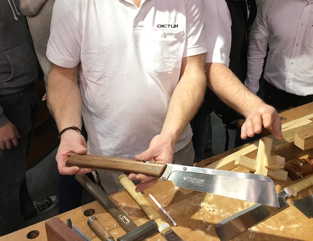 Weiter ging es mit dem Stand von DICTUM. Dort wurde ein breiter Querschnitt durch das Sortiment von hochwertigen Handwerkzeugen gezeigt. Ein der Neuheiten ist eine japanische Klappsäge mit Holzgriff, die sehr angenehm in der Hand liegt.