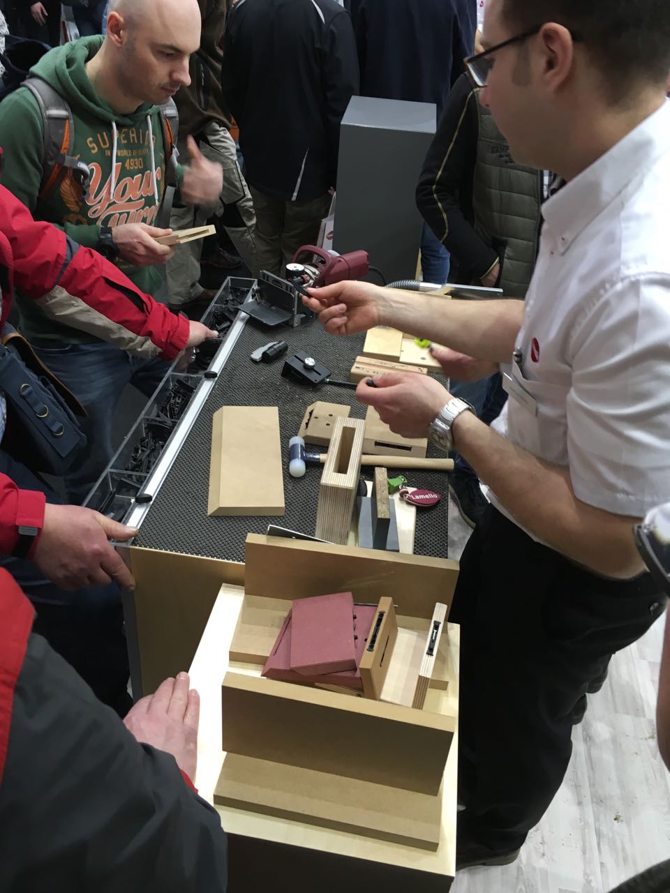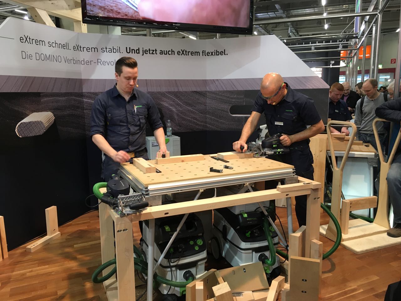 Erstes Highlight war der Stand von Festool. Dort wurden die neuen lösbaren Domino-Verbinder für die bekannte Domino-Fräse vorgestellt. Leider braucht es dazu die Domino-XL Fräse, mit der normalen Domino-Fräse wie ich sie habe geht es leider nicht. Die Zielgruppe sind stabile Verbindungen für hoch belastete Teile wie z.B. Bett- oder Tischgestelle.