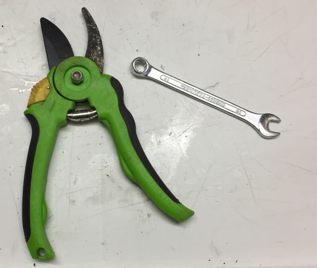 Als Werkzeug benötigt man nur einen Schraubendreher um die zentrale Schraube aus dem Gelenk der Schere herausdrehen zu können.