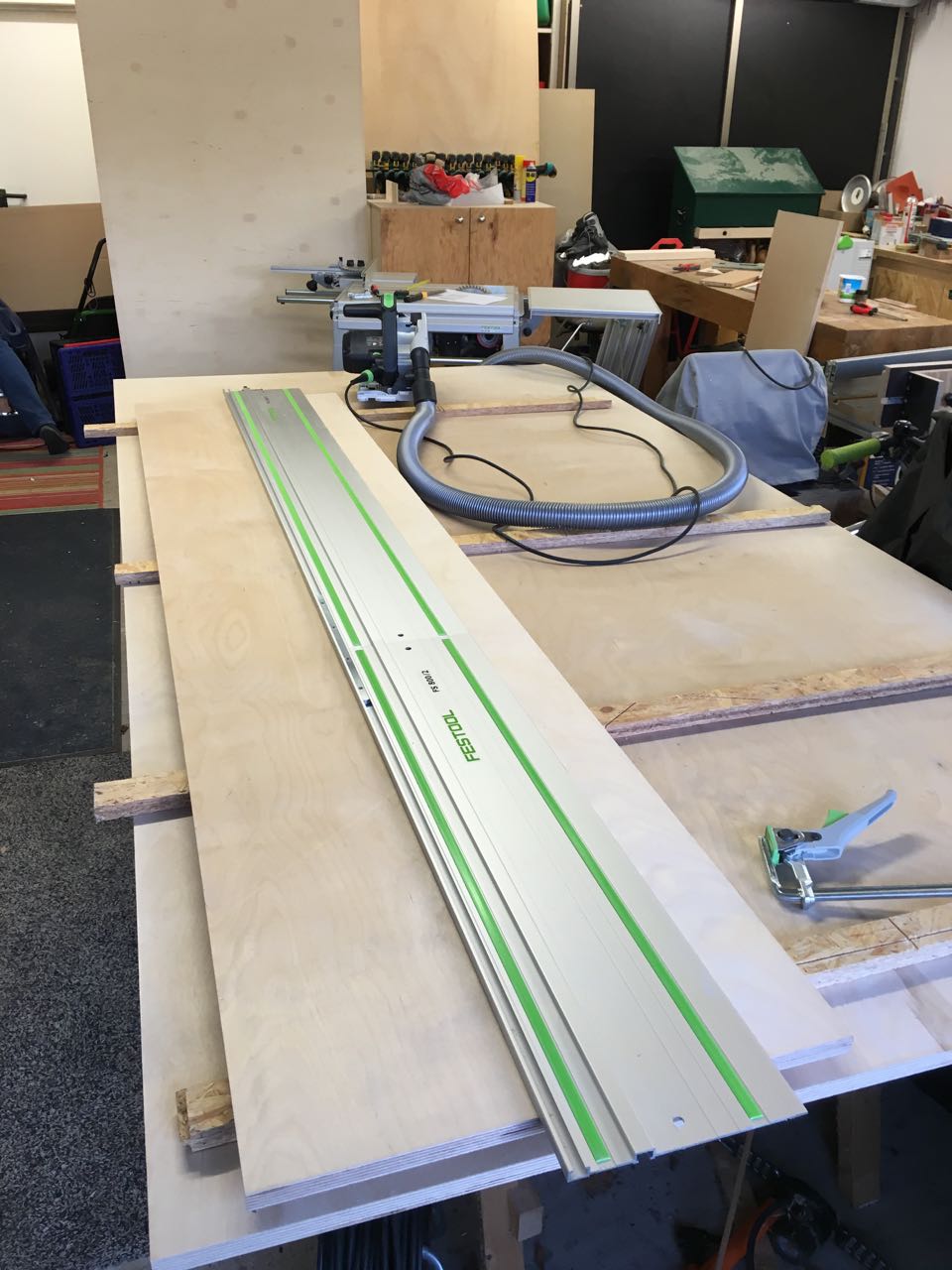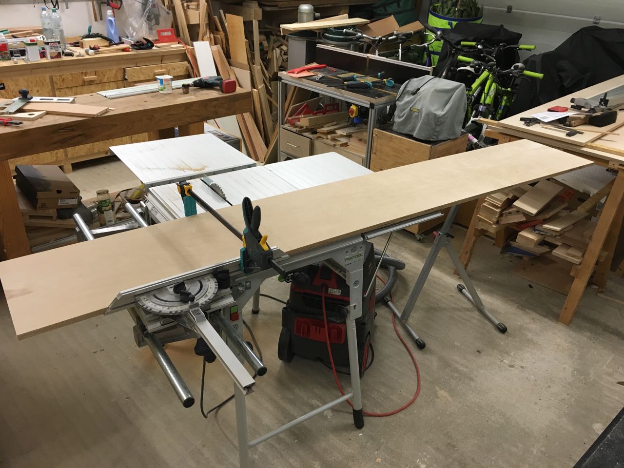 Damit die schwere Platte beim Schieben am Anschlag bleibt, habe ich diese mit einer Einhandzwinge fixiert. Die Platte ist aber dennoch so schwer, dass diese meinen kleinen Schiebetisch an der CS70 an seine Grenzen bringt. Das nächste Mal werde ich auch beim Ablägen der Multiplexstreifen mit Tauchsäge und Führungsschiene arbeiten.
