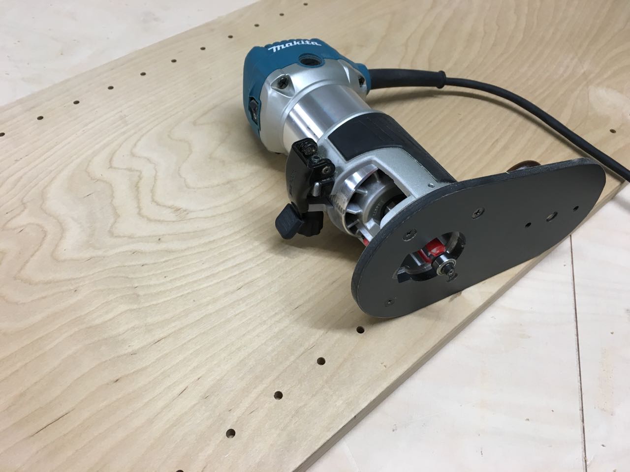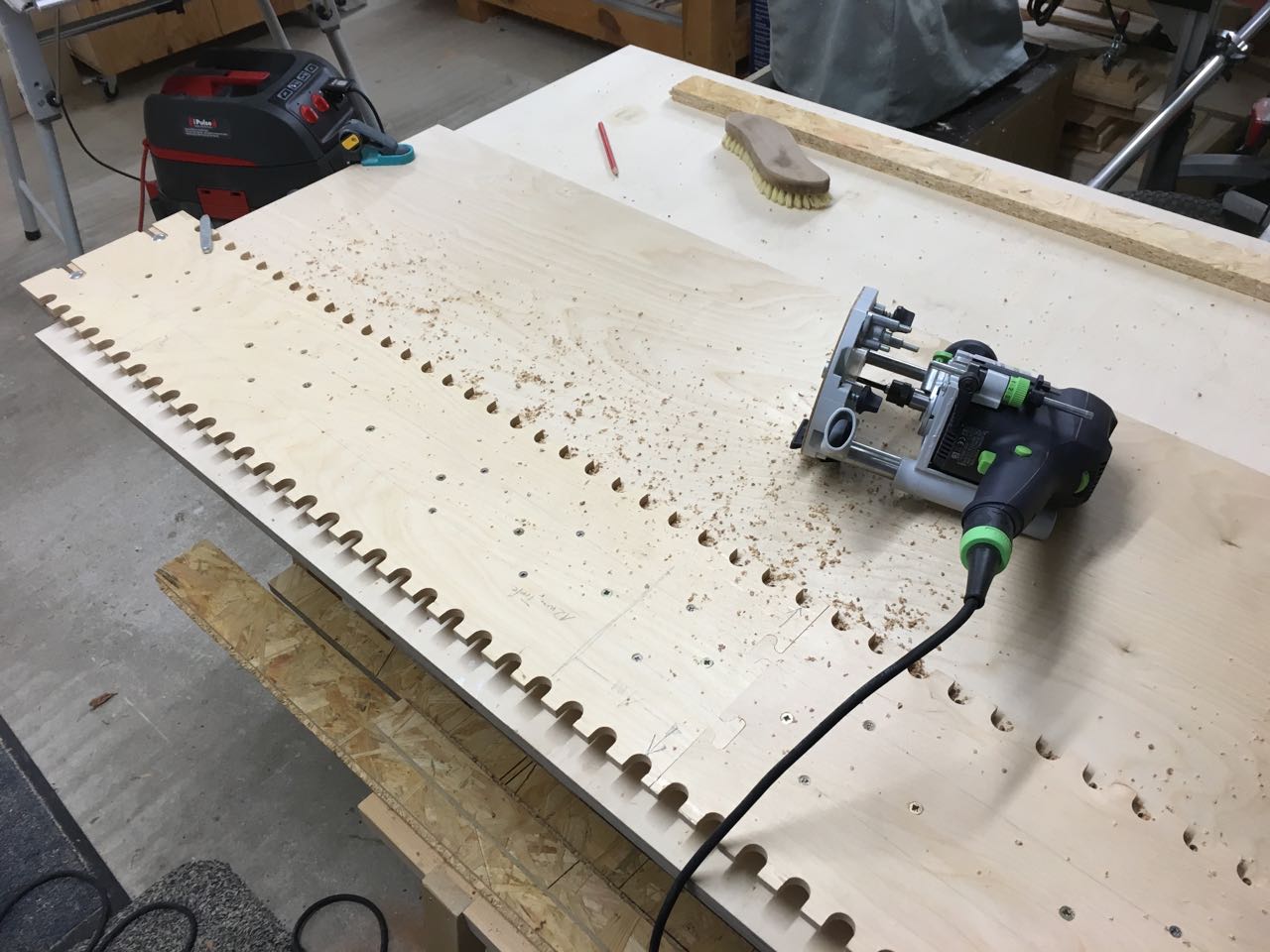 Nächster Arbeitsschritt ist das Anbringen der Lochreihen. Hier kommt meine altbewährte Bohrschablone für die Festool Oberfräse mit 19mm Einlagering zum Einsatz.