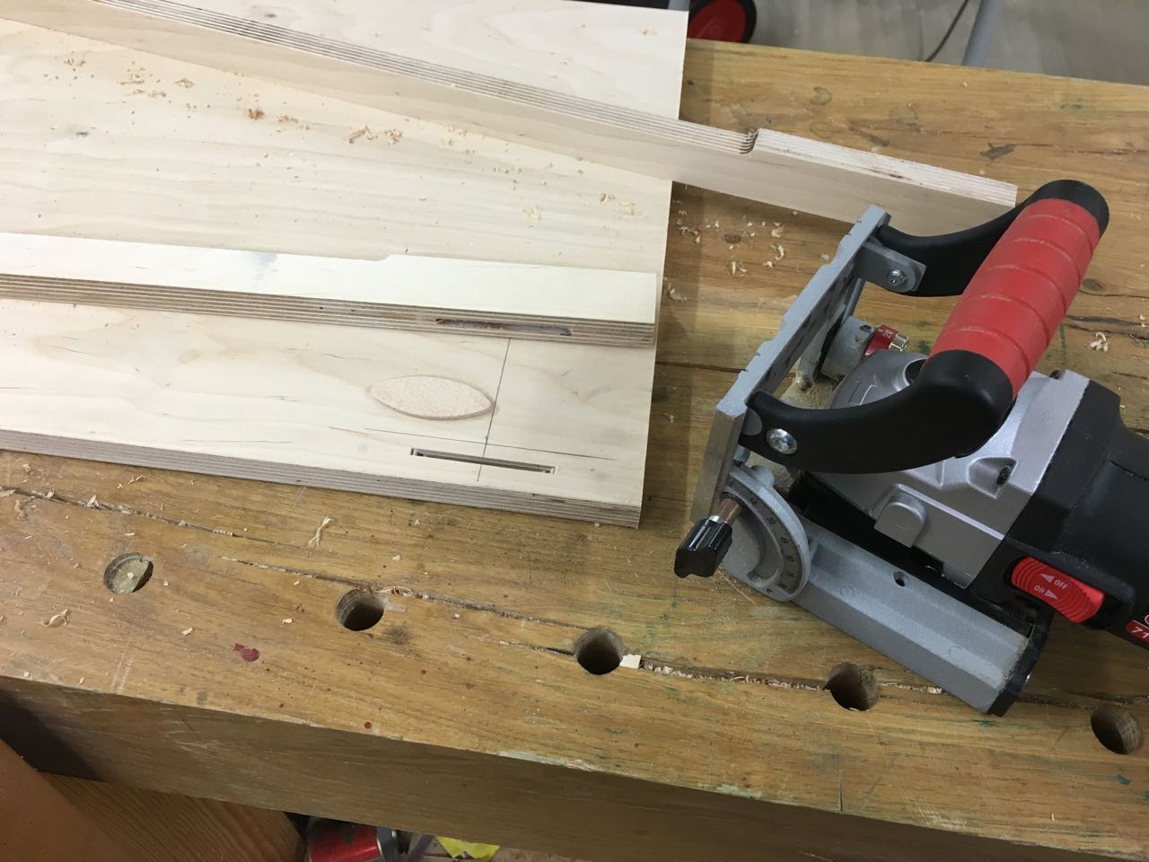 Um das Ausrichten der zu verschraubenden Bauteile zu erleichtern fräse ich Schlitze mit der Flachdübelfräse. Dort werden dann Flachdübel ohne Leim eingesetzt. Die betrifft den Boden, den Mittelträger und den Deckel des Bücherregals.