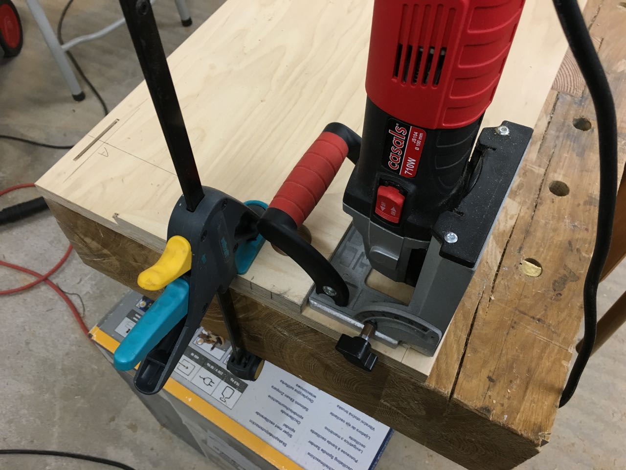 Nach der Demontage der Confirmatschrauben werden alle sichtbaren Kanten der Holzteile mit einem 2mm Abrundfräser und der kleinen Makitafräse gefast.
