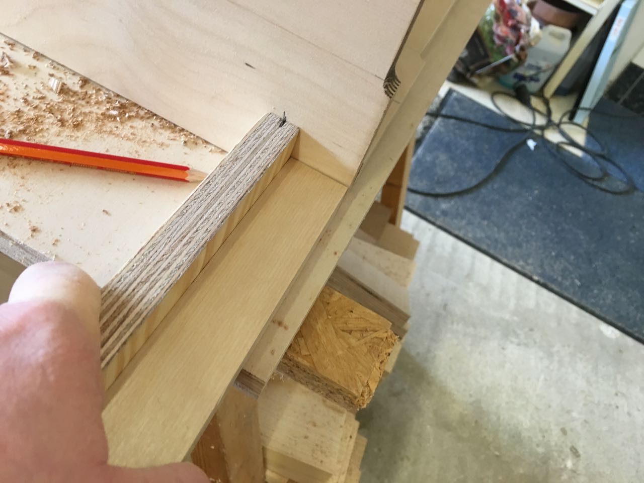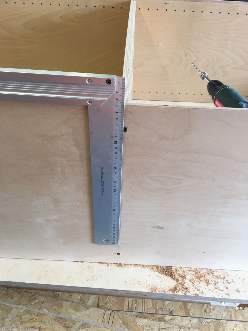 Nach dem Bohren aller Löcher werden probeweise die Confirmat-Schrauben vorsichtig von Hand eingedreht. Anschließend werden die genauen Maße für die Rückwand aus 6,5mm Birkenmultiplex ermittelt und diese zugesägt.