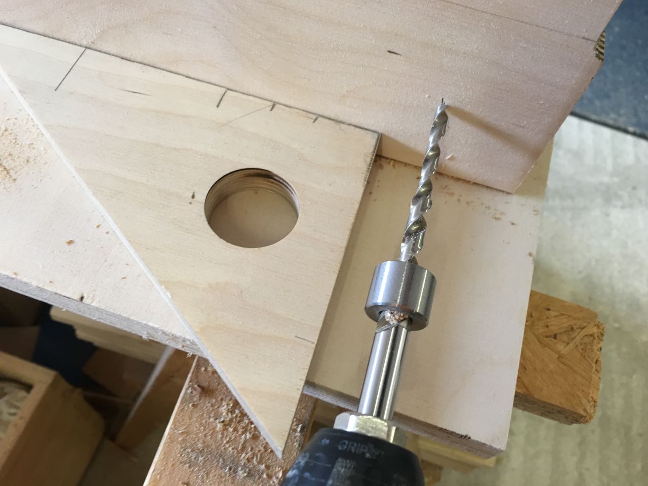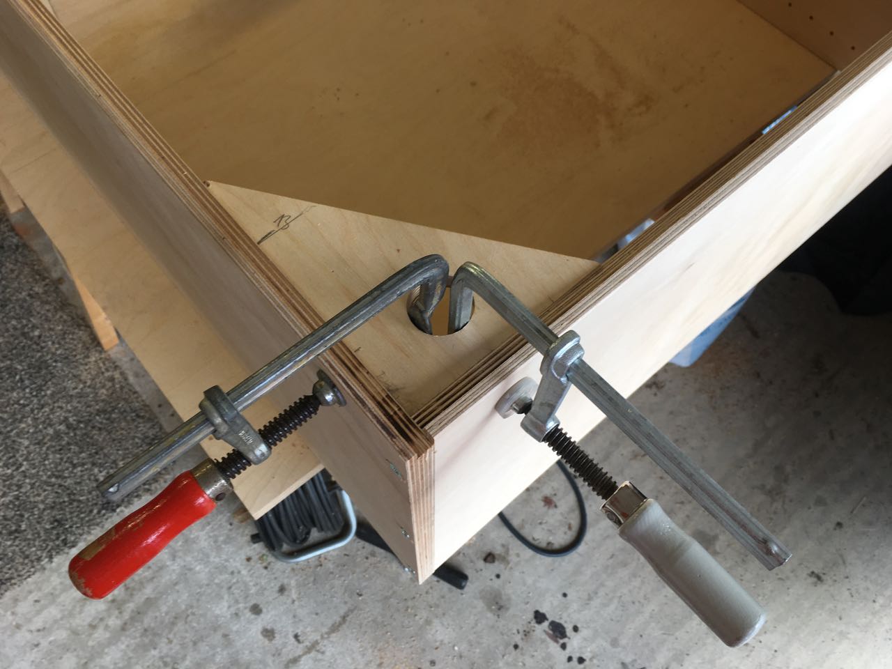 Die Bauteile werden rechtwinkling ausgerichtet und mit Zwingen fixiert. Das kann mit Winkelzwingen erfolgen oder aber mit einem einfachen Holzwinkel mit Lochbohrung wie hier gezeigt.