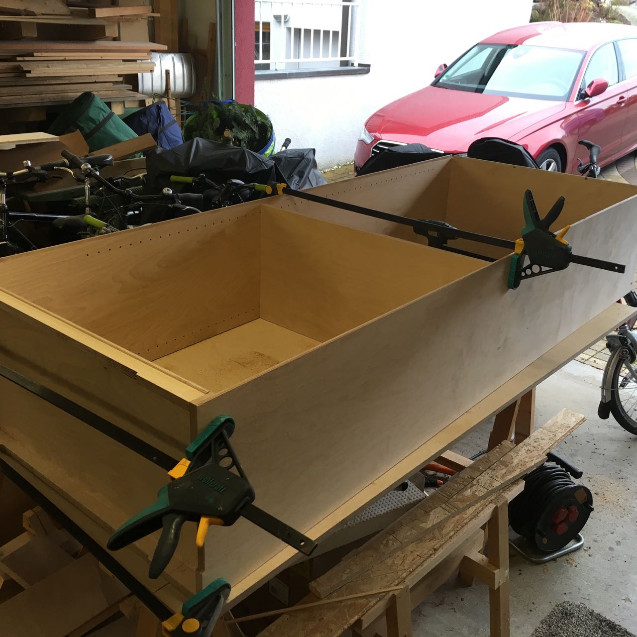Bei Holzhändler werden jeweils zwei ganze Platten (125*250cm) Birkenmultiplex mit 18mm und eine Platte mit 6,5mm für die Rückwand gekauft. Gesamtpreis für das Holz rund 150 EUR.