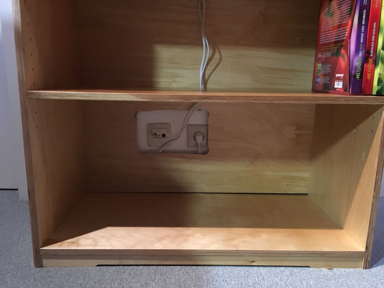 Auf diese Weise ist nur ein kleines Loch an der Hinterkante, was später auch optisch nicht stört, wenn der Fernseher einmal entfernt wird und das Regal wieder als reines Bücherregal zum Einsatz kommt.
