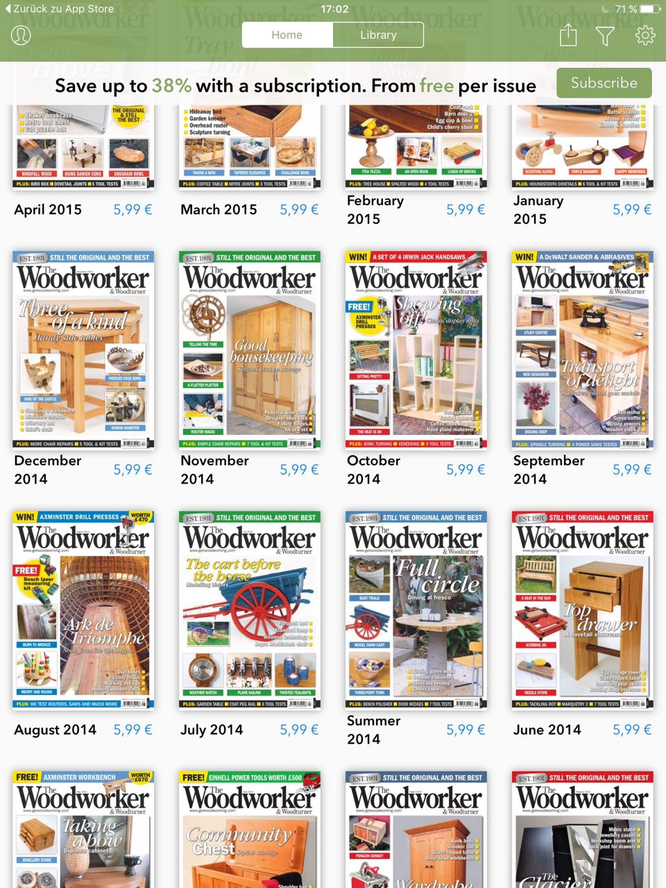 Eine Sonderrolle nimmt für mich dabei die deutsche Zeitschrift „Holzwerken“ ein. Die kaufe ich in Papierform. Warum? Zum einen weil diese Problemlos im Zeitschriftenhandel zu bekommen ist, zum anderen weil dies die einzige Zeitschrift ist, deren elektronische Ausgabe auf dem iPad teuerer ist als das gedruckte Heft.