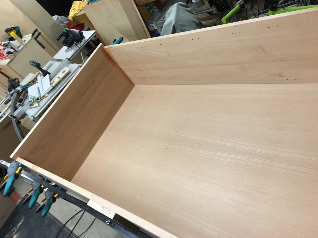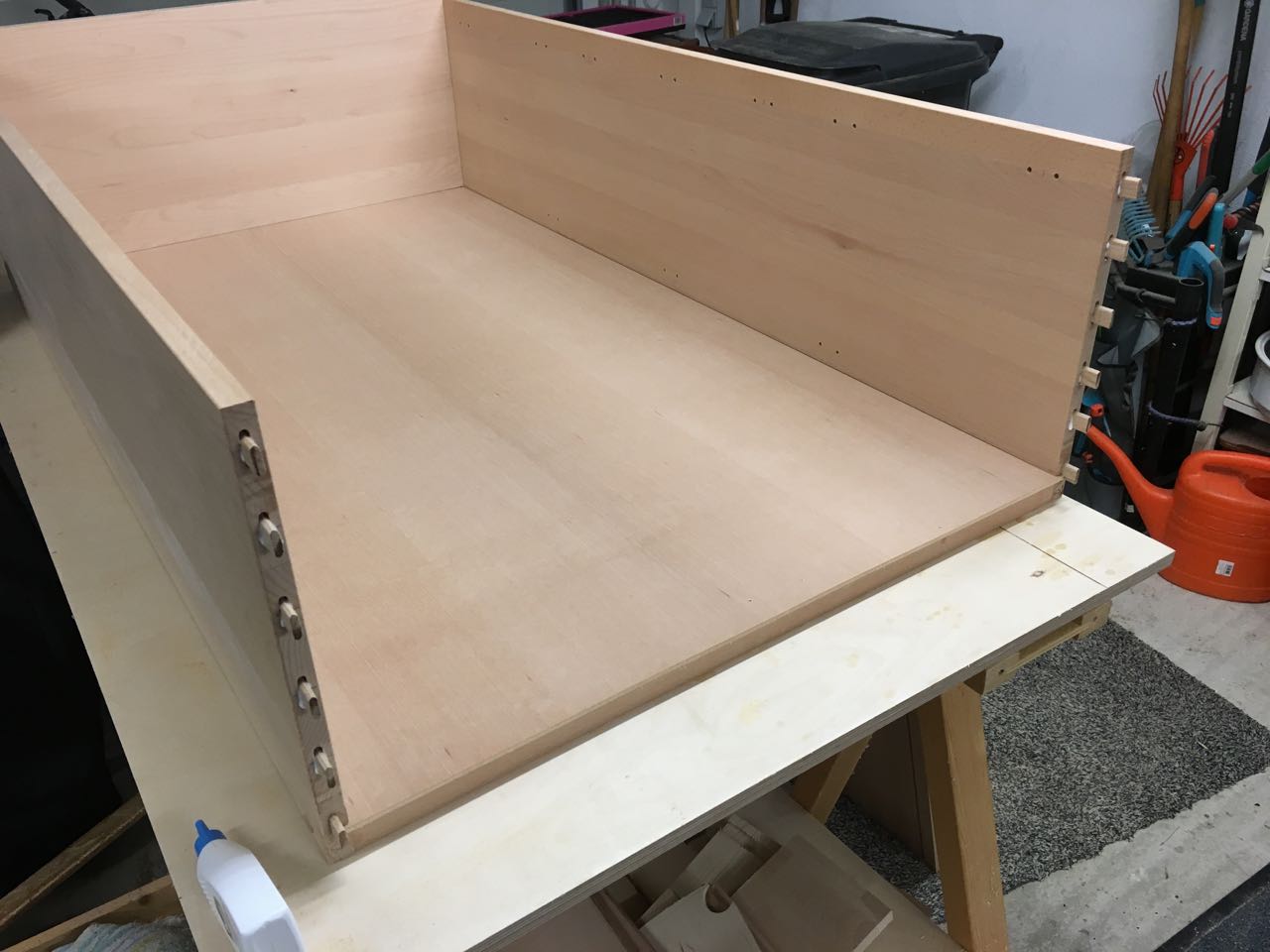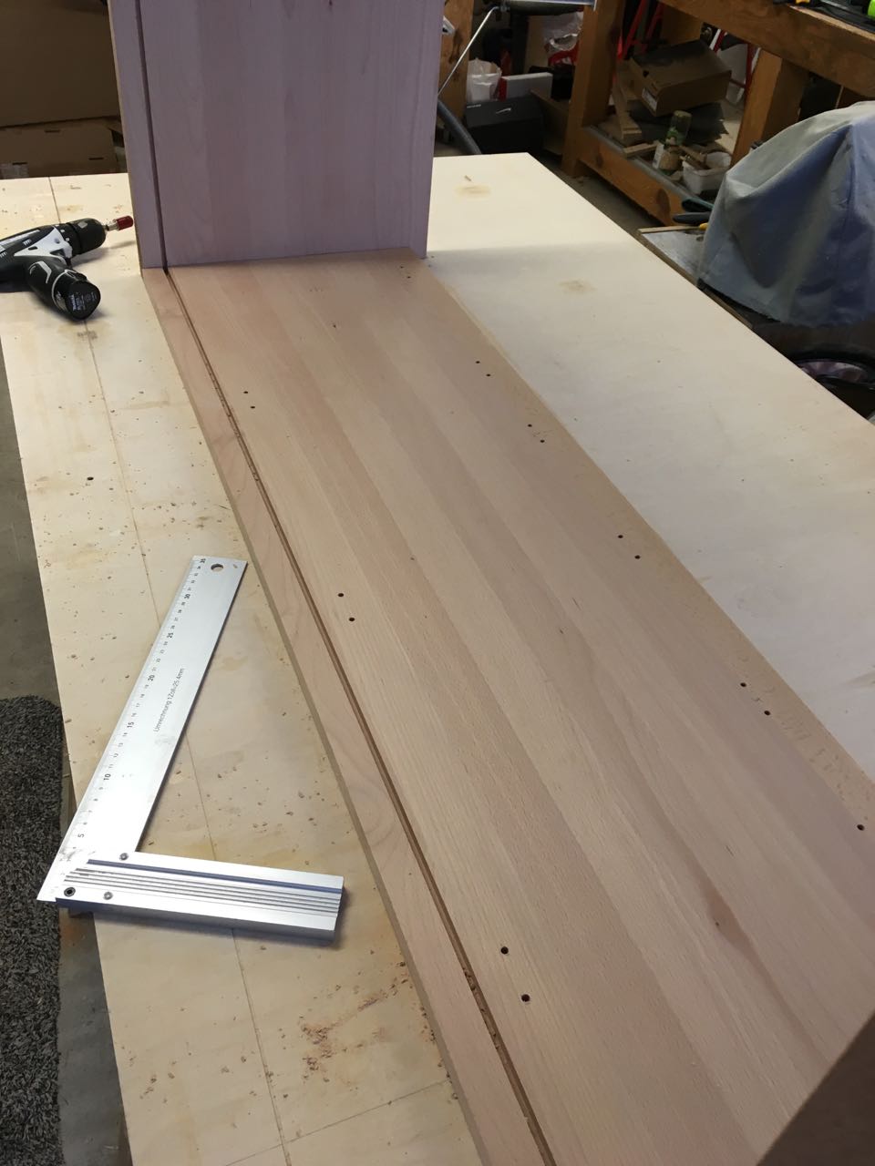 Bevor jetzt aber die Rückwand eingesetzt und der Deckel aufgeklebt wurde, habe ich die Löcher für die Topfscharniere und die Fachbodenhalter gebohrt.