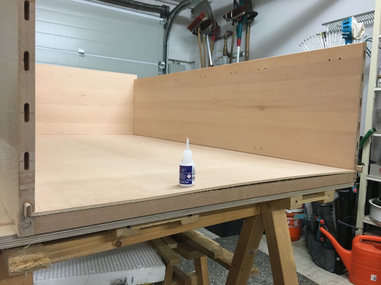 Damit das Aufsetzen des Deckels keine Fummelei wird, habe ich einfach die Rückwand mit ein paar Tropfen Sekundenkleber dünnflüssig am Querträger fixiert.