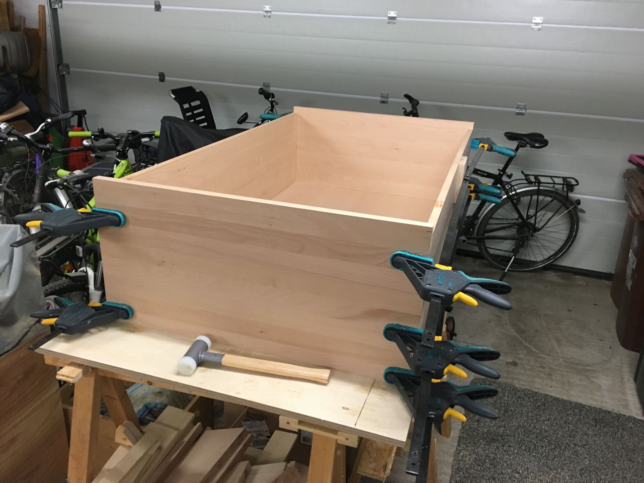 Durch die Lagerung der Leimholz-Bauteile in der Garage hatten sich diese leider ein wenig verzogen, weshalb hier ebenfalls mit Zwingen nachgeholfen werden mußte, um alles bündig zu bekommen.