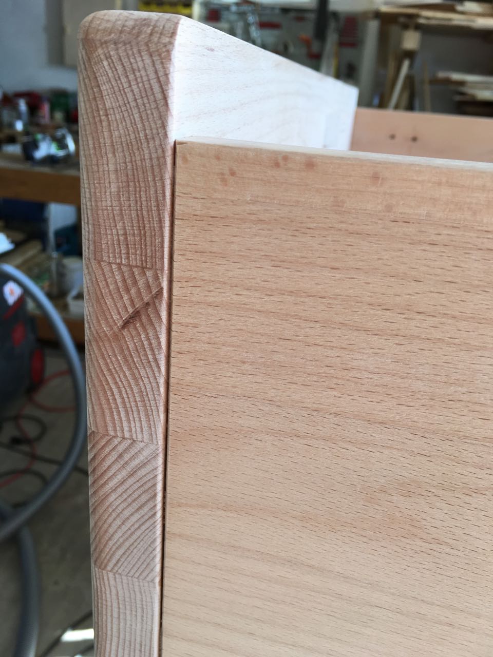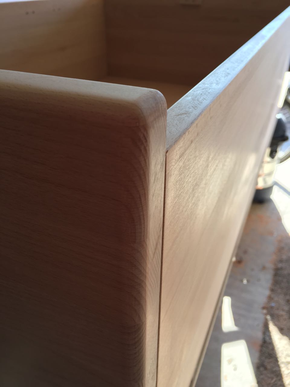 Dummerweise die Fräse dabei fast in Gesichtshöhe – also fliegen einem die Späne sprichwortlich vor der Nase herum. Abschließend werden alle Fräskanten noch mit 120er/240er Schleifpapier von Hand geglättet. Und hier das Ergebnis im Detail: