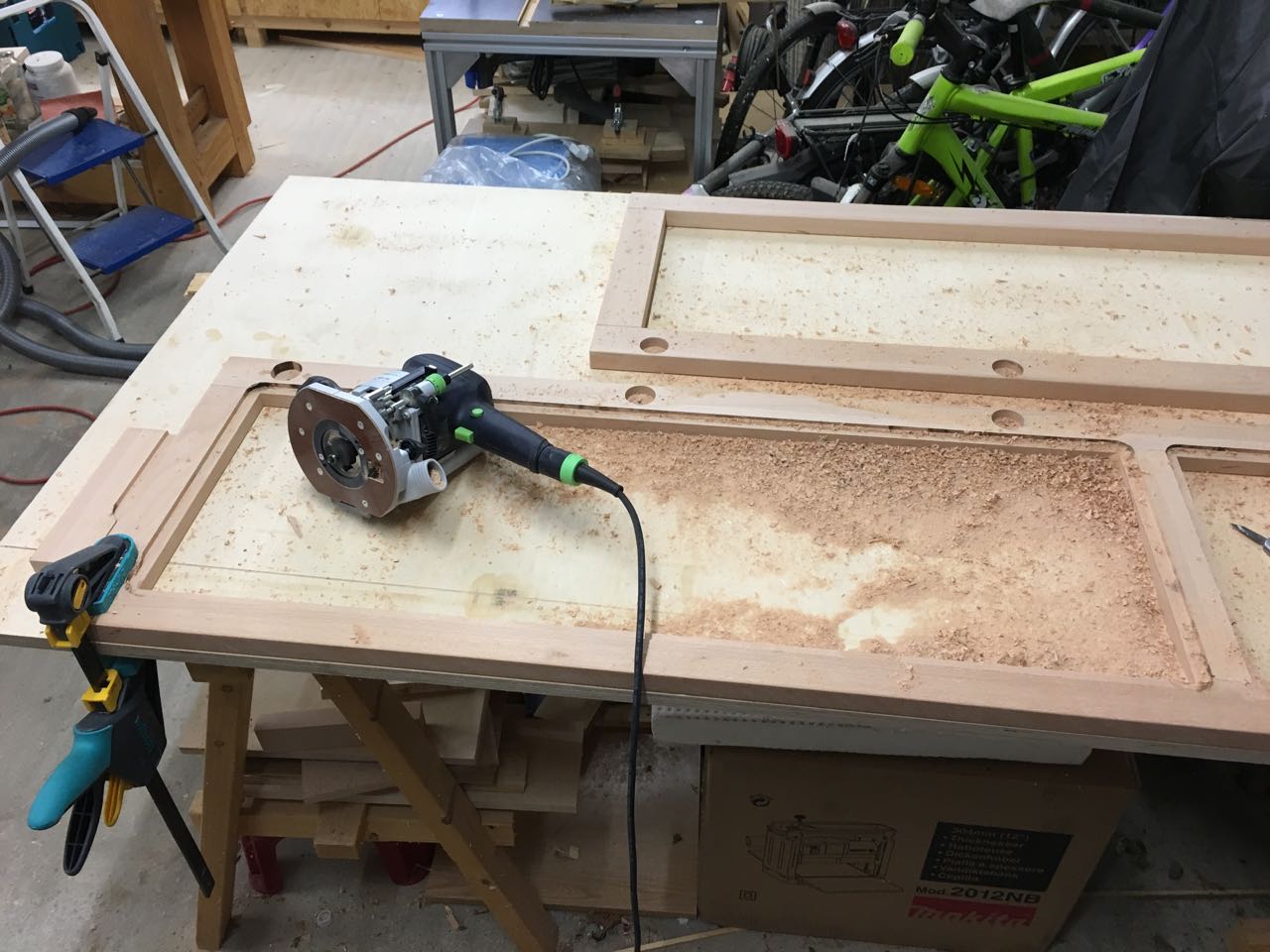 Hier hatte ich eigentlich geplant weiterhin mit der kleinen Makitafräse zu arbeiten, aber der große Falzfräser überlastet die kleine 700 Watt Maschine gnadenlos. Der Motor kam in den Ecken nahezu zum Stillstand und wurde auch sehr heiß.