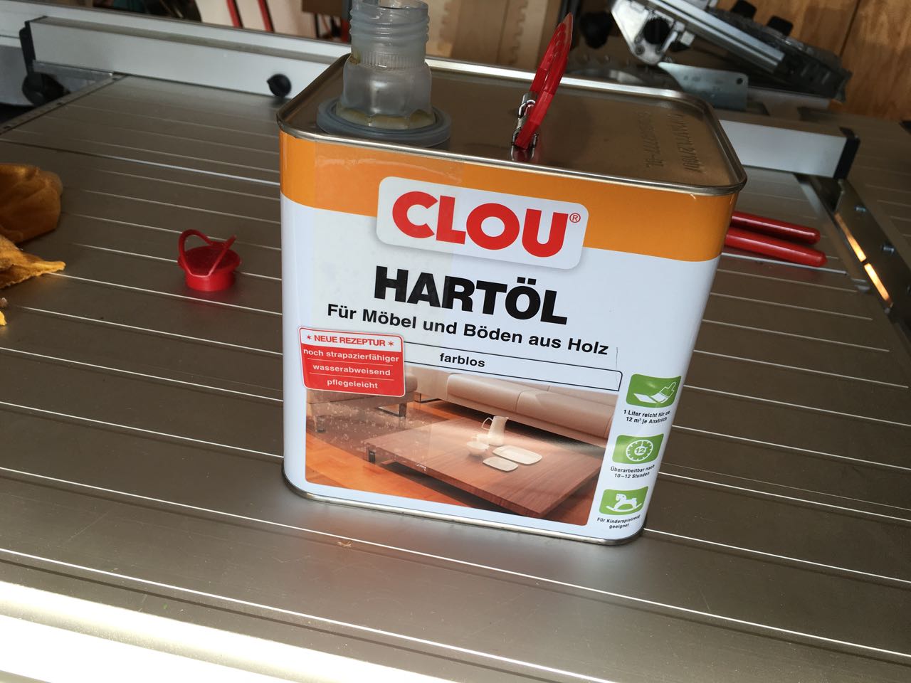Wie schon bei meinem Wohnzimmertisch habe ich auch hier für die Oberflächenbehandlung wieder auf das bewährte CLOU Hartöl zurückgegriffen. Allerdings habe ich diesmal gleich ein größeres Gebinde gekauft, denn es werden ja noch einige Schränke folgen, bis die geplante Wohnwand komplett ist.