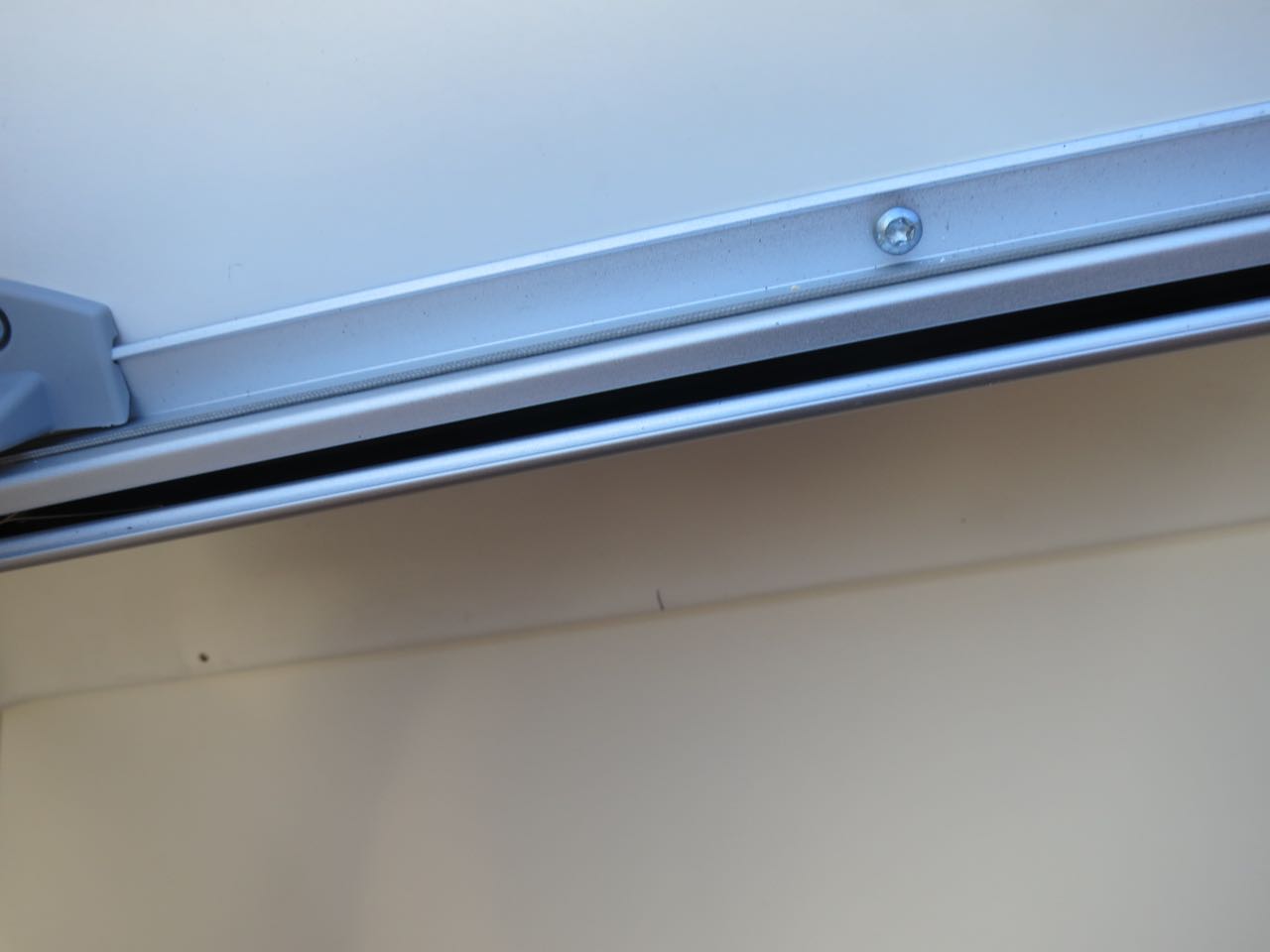 - Die Führungsschienen laufen in der Flucht nicht exakt parallel. Grund sind die nicht rechtwinkeligen Flanken des Fensterrahmens.