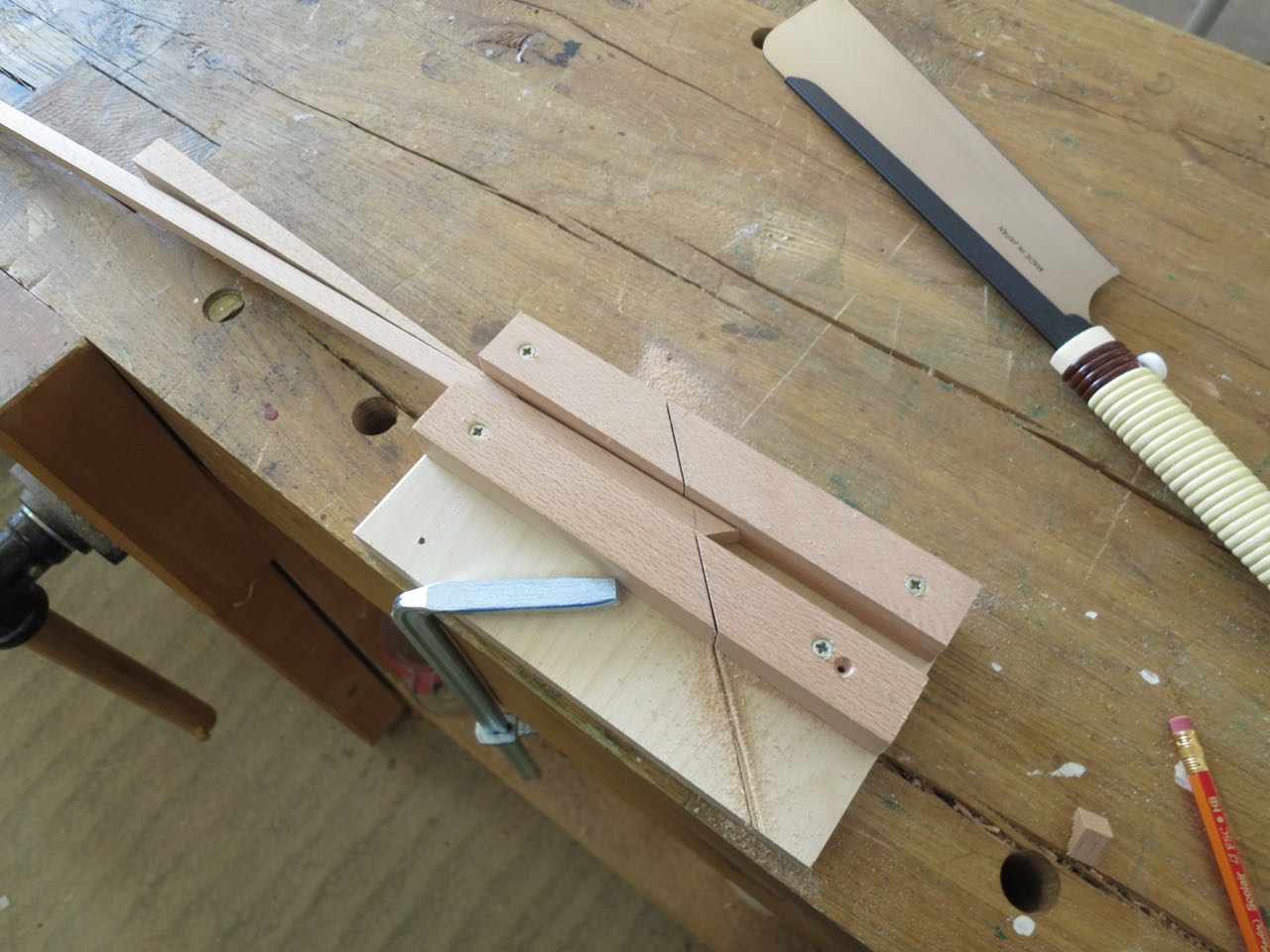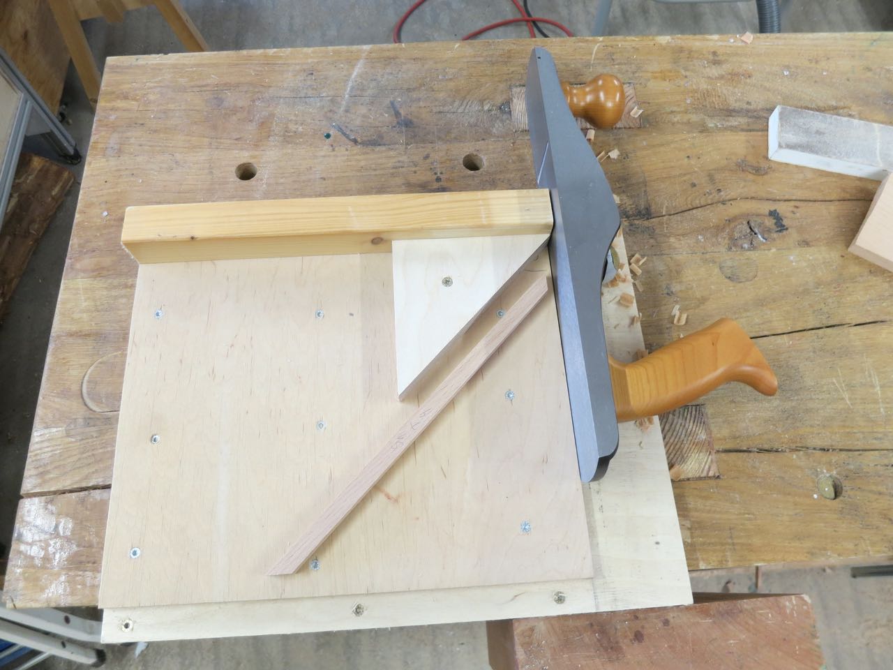 Um die Leisten mit einer feinen Dozuki Japansäge auf Gehrung abzulängen, habe ich mir eine kleine Sägelade gebaut. Diese besteht aus zwei Reststücken des Buchenleimholzes und einer Grundplatte aus Multiplex.