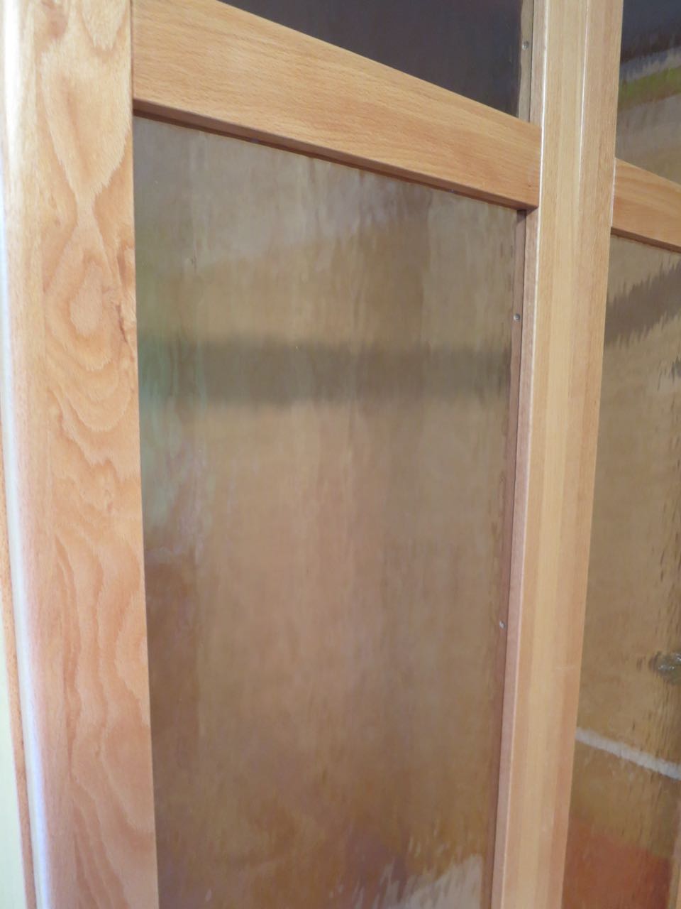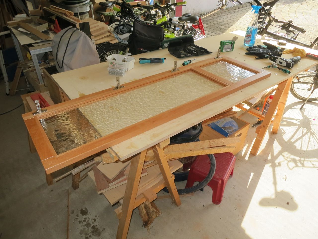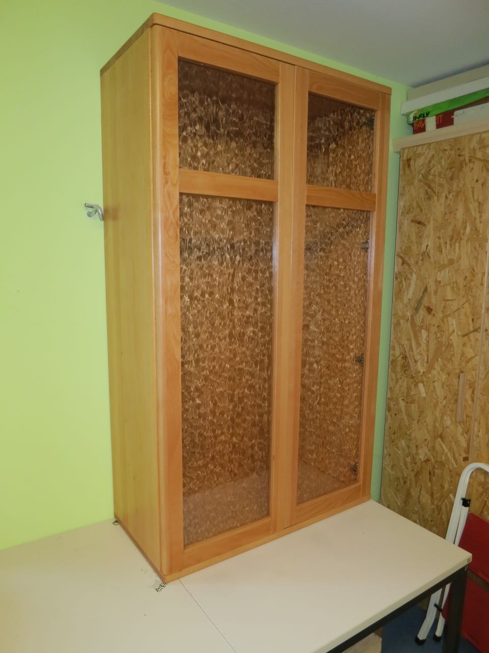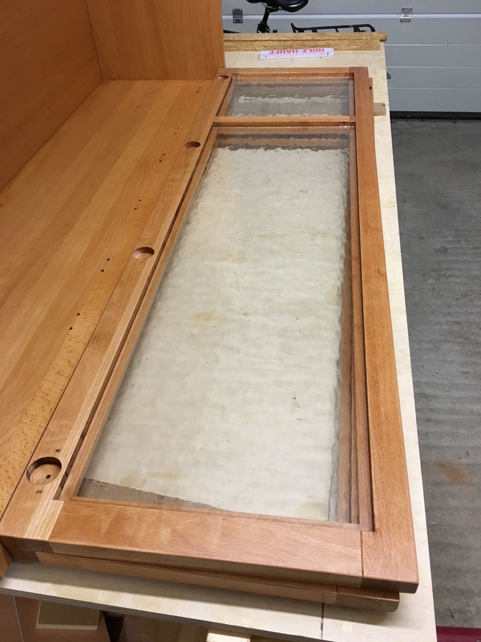 Es folgt die abschließende Beschreibung der letzten Bauschritte des Hängeschrankes mit Glastüren. Zentraler Arbeitsschritt war die Verglasung der Schranktüren.