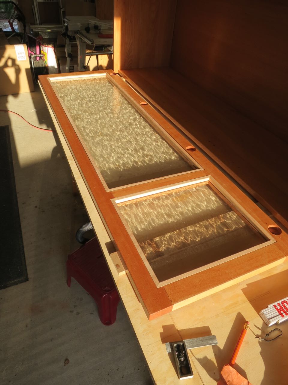 Das Einrahmen der Glasplatten erfolgte mit dünnen Leisten, die ich auf der Tischkreissäge zugeschnitten habe. Dazu gibt es einen gesonderten Artikel in dem ich diese Vorgang mit einem Video zeige.