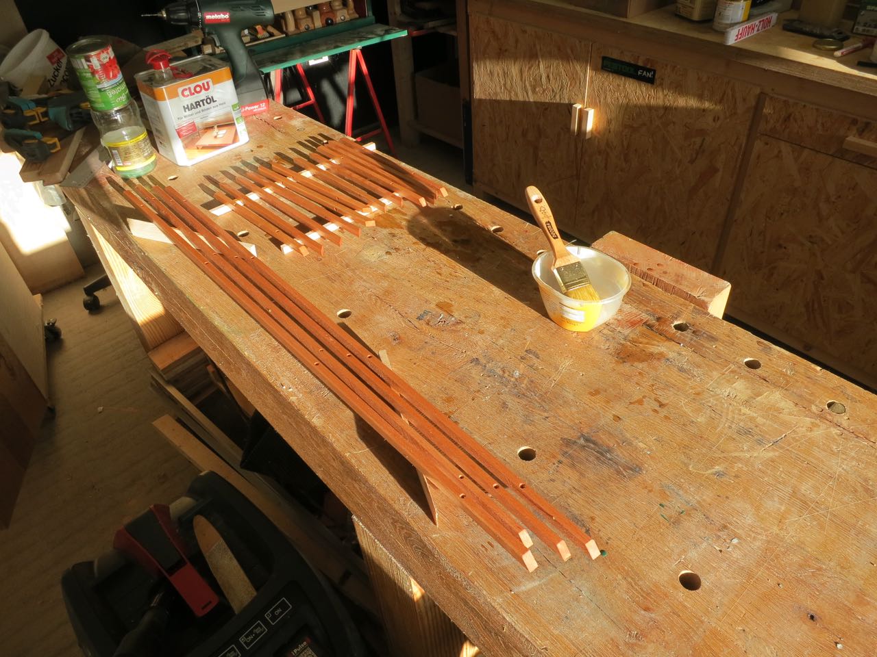 Hier durfte ich dann die Erfahrung machen, dass man geölte Holzteile nicht in die direkte Sonne legen sollte, weil das so nur ganz ungleichmäßig trocknet, Es braucht dann etwas Fummelei und viel Zeit, bis alles wieder eine gleichmäßige Oberfläche hat.