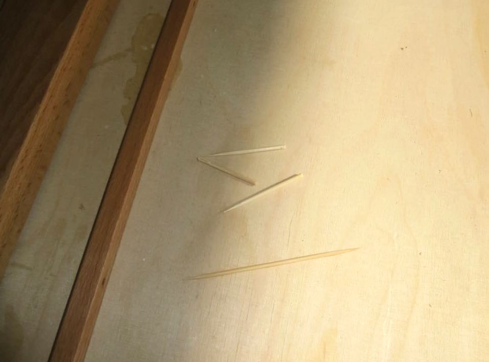 Dazu werden jeweils oben an der Außenseite und unten an der Scharnierseite zwei Hälften eines Holzspieschen eingeklemmt, um so die Platte am Wackeln zu hindern.