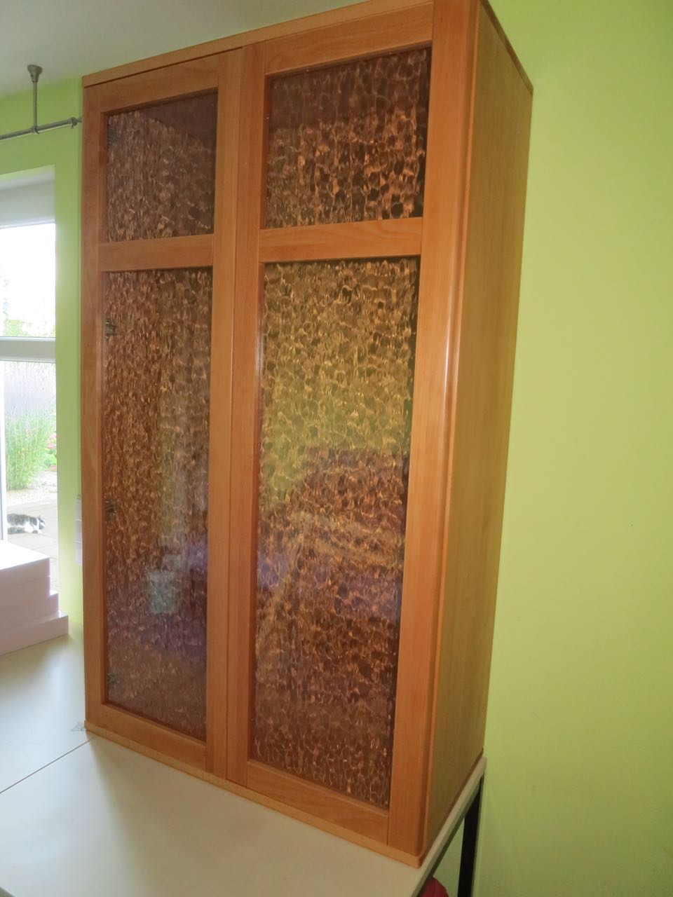 Nach einigem Nachdenken habe ich mich dann für transparentes Kathedralglas entschieden. Der Grund liegt darin, dass ich diesen Schrank nicht als Vitrine zum Ausstellen von Gegenständen nutzen möchte. Statt dessen sehe ich die Glasflächen vor allem als gestaltendes Element in der geplanten Wohnwand.