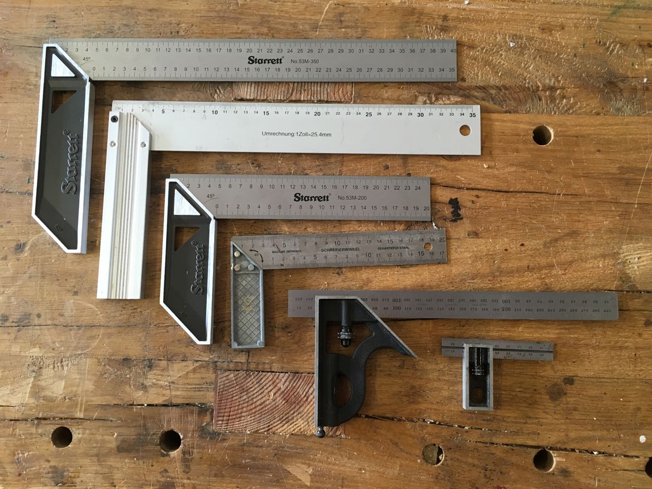 Von oben nach unten: Starrett Schreinerwinkel 35cm, OBI Aluwinkel 35cm, Starrett Schreinerwinkel 20cm, Bauhaus Winkel 20cm, Starrett-Kombinationswinkel, kleiner Starrett Anschlagwinkel.