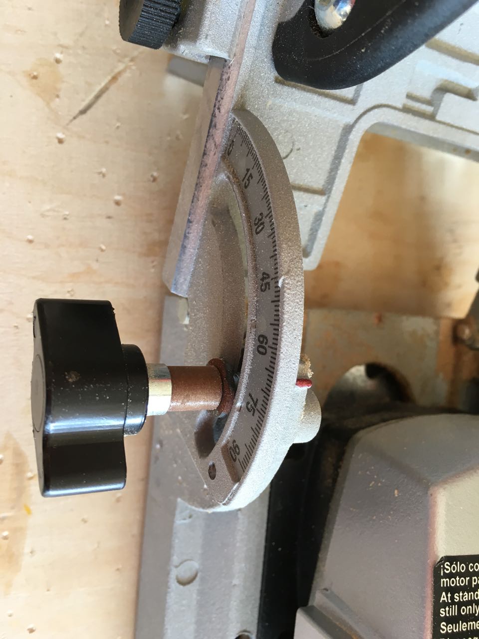 Der Winkelanschlag der CASALS JS 104 K Flachdübelfräse lässt sich ja in 15Grad Schritten verstellen und rastet auch ein. Das Ablesen des Winkels erfolgt aber NICHT durch die Skala an der Seite sondern über die kleine, rote Markierung oben an der Fräse. Die beiden nachfolgenden Bilder zeigen diese Markierung.