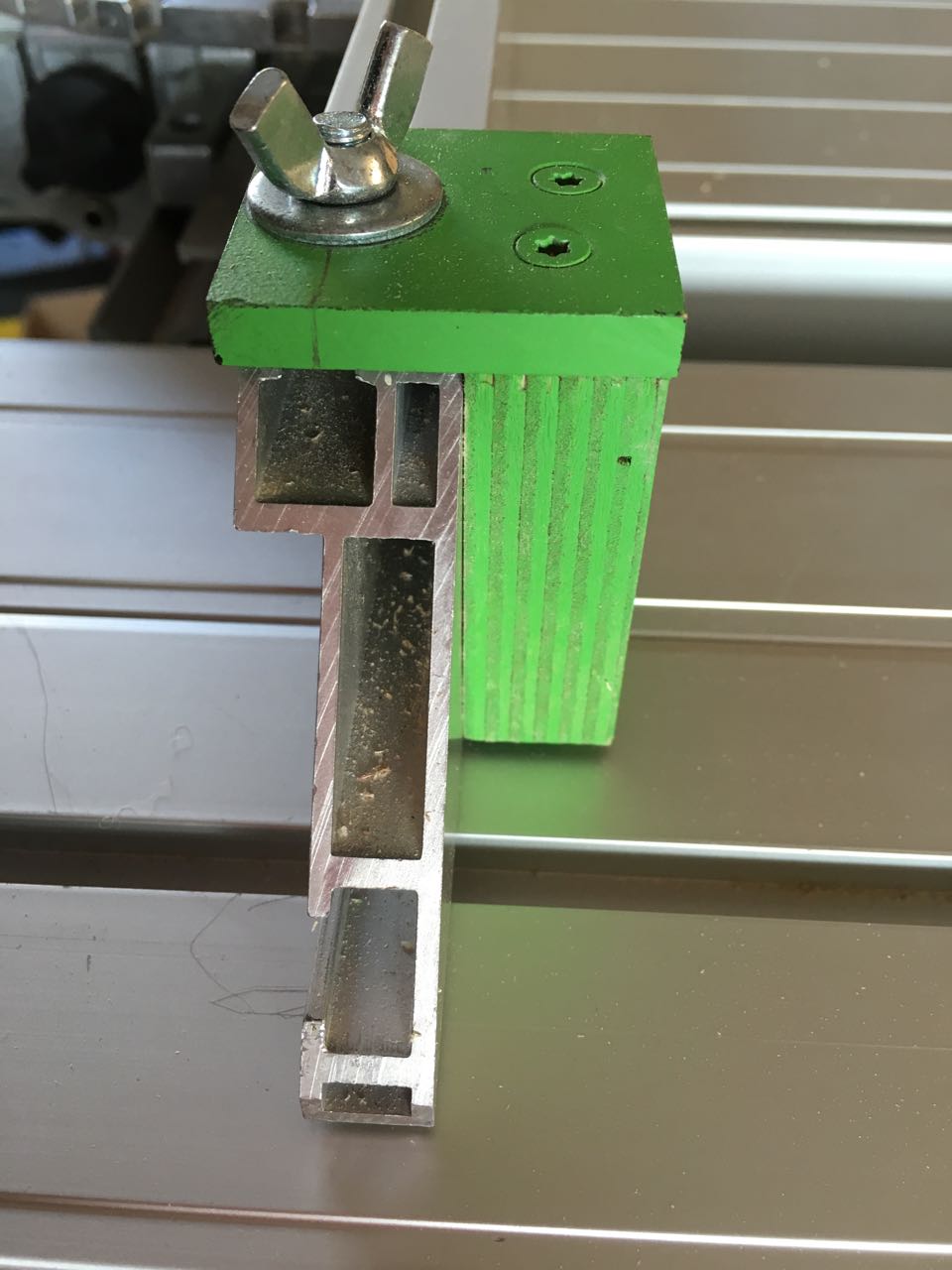 Daher habe ich aus einer M6-Sechskanntschraube nebst Flügelmutter und einigen Holzresten einen einfachen Anschlag selbst gebaut.