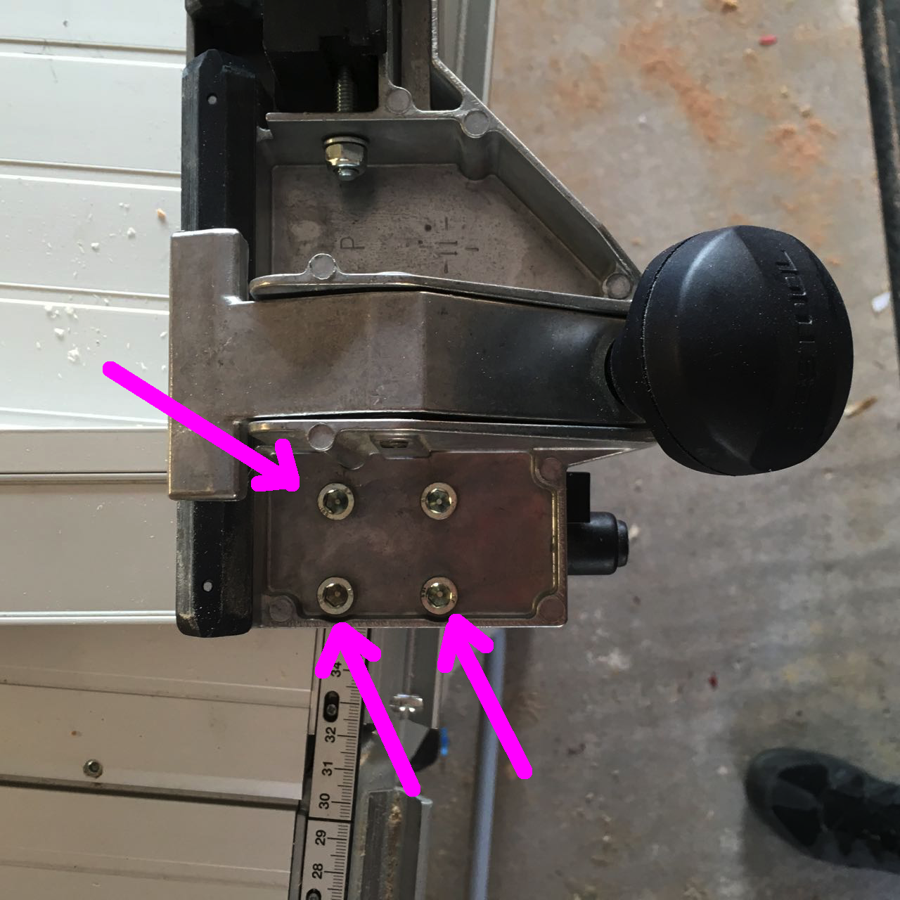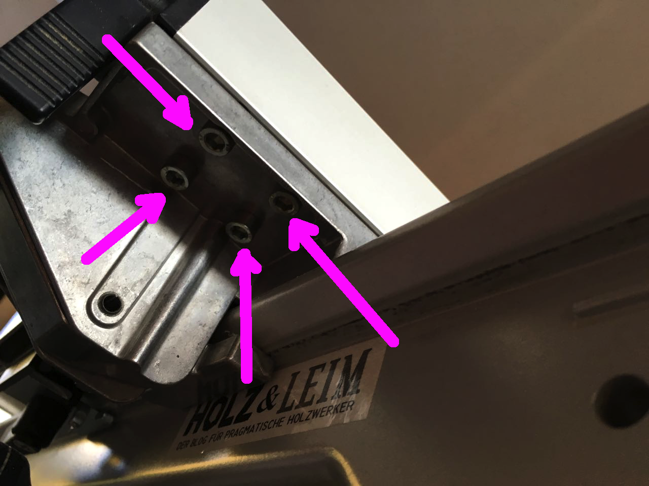 Zuerst die Tischnuten an der CS70 von Staub und Schmutz reinigen. Nun den demontierten Längsanschlag umdrehen. Im vorderen Bereich der Klemmung sind vier Schrauben zu sehen. Hiervon werden drei Stück ein wenig gelockert, sodaß diese wackeln.