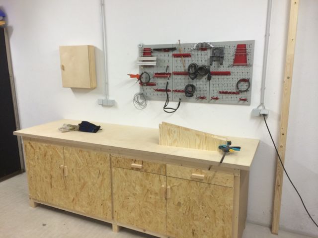 wenn du Türen anschlagen willst, würde ich noch eine Mittelwand einsetzen und nicht 2 sondern 4 Türen machen, da sie ansonsten sehr breit sind und somit tief über die Werkbank ausschlagen.