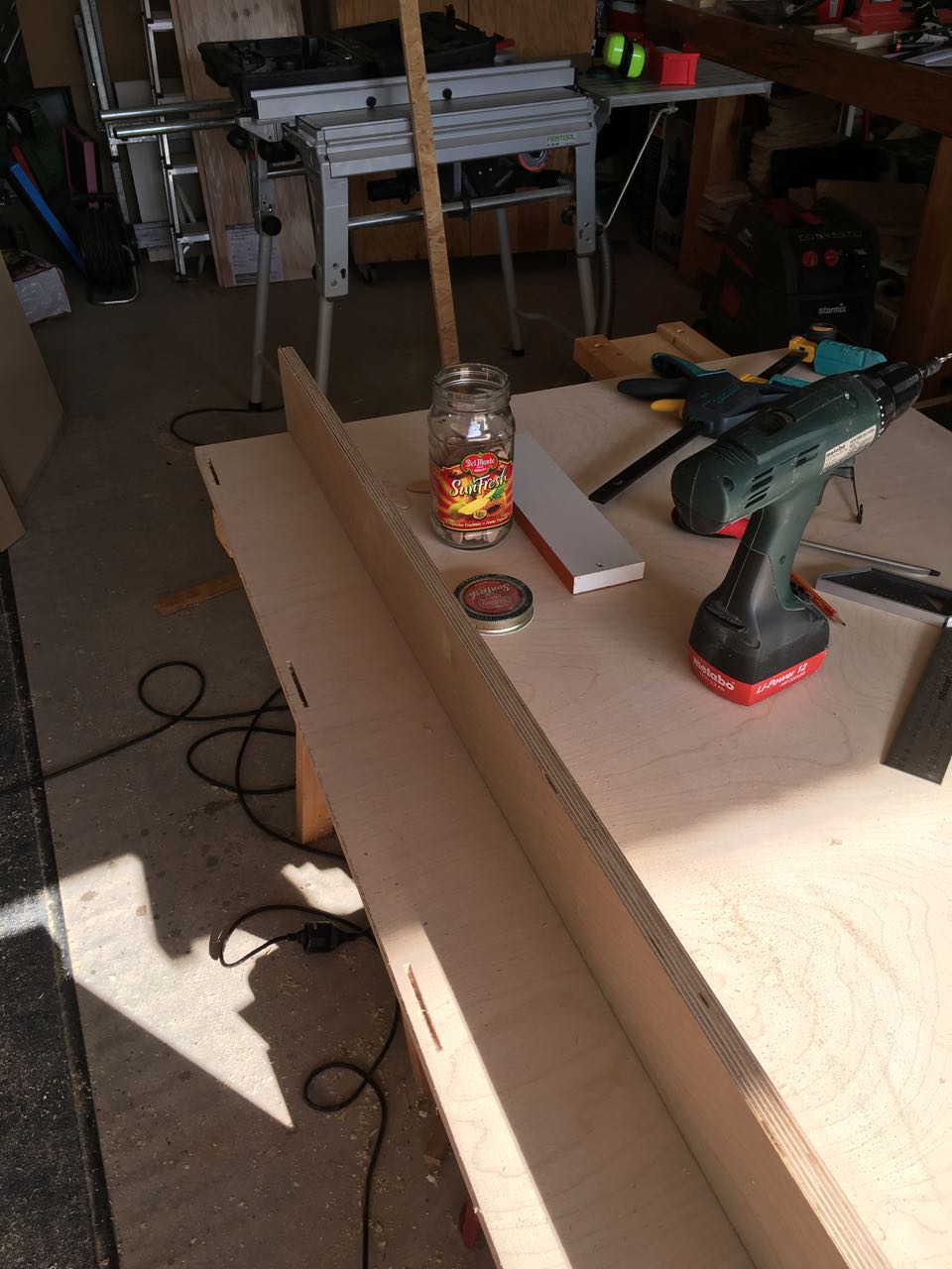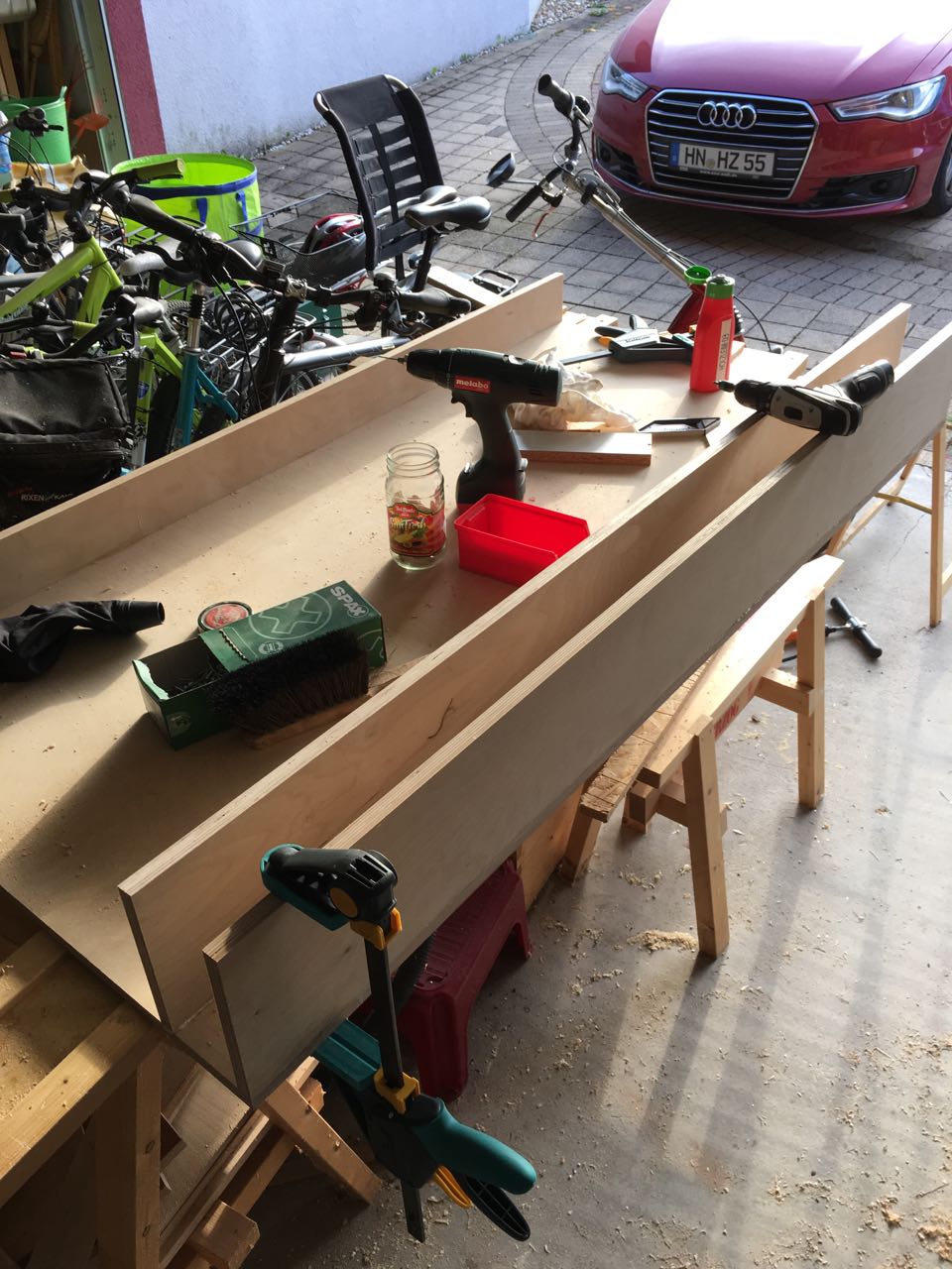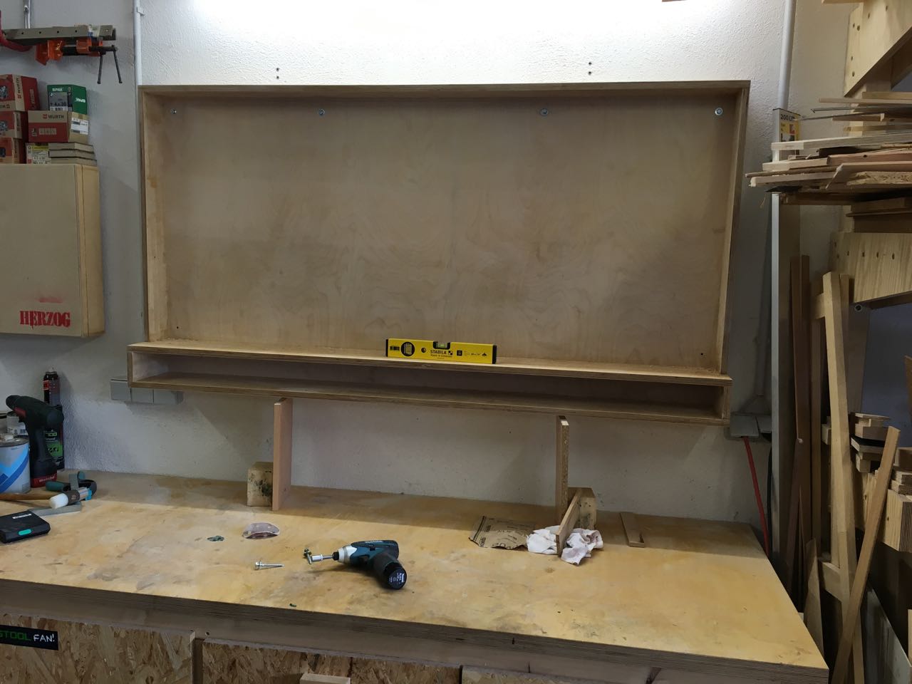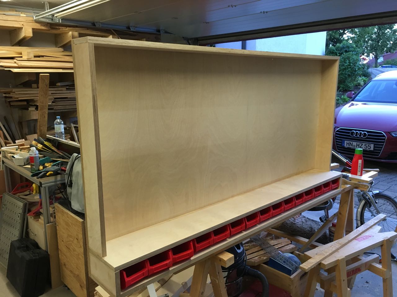 Ich habe mich daher nach einigen Überlegungen für eine paragmatische Lösung entschieden – einen offenen Rahmen mit einer Holzwand dahinter. Der Rahmen erfüllt dabei zwei Aufgaben: Er bietet eine Ablagefläche um für die jeweiligen Projekte die nötigen Kleinteile parat zu haben, zudem kann so darunter eine Reihe von Sichtlagerkästen platziert werden. Zun Anderen kann ich hier später Türen, eine Vorhang oder ähnliches anbringen, um das Werkzeug vor dem Verstauben zu schützen.