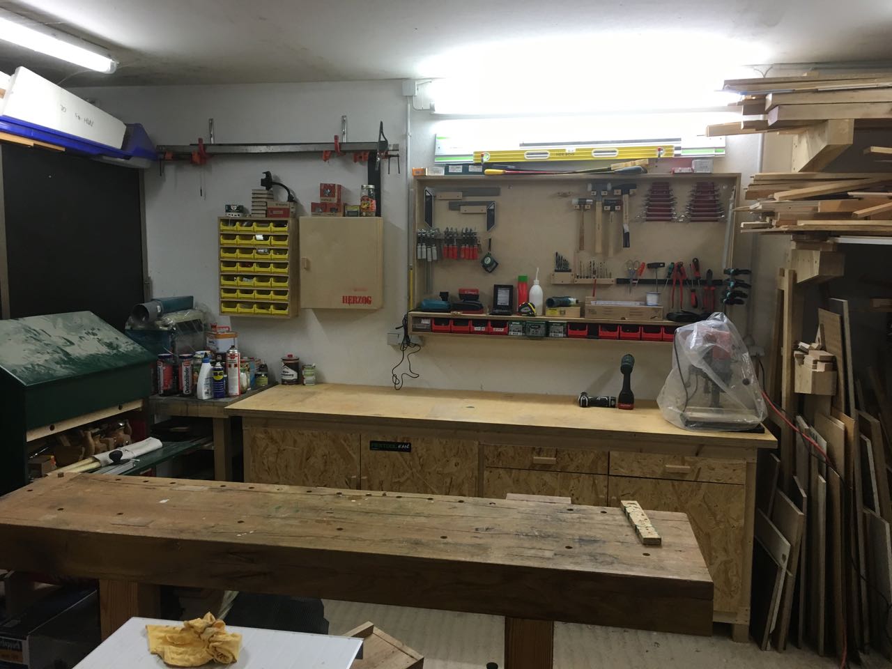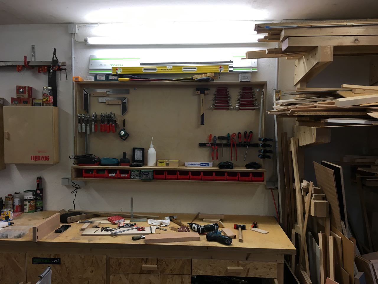 Mein persönlicher Vorschlag wäre, in die Werkzeugwand noch einige zusätzliche kleine Lämpchen einzubauen, würde erstens schöner aussehen und zweitens findest du dann sicher schneller die Geräte! 😉