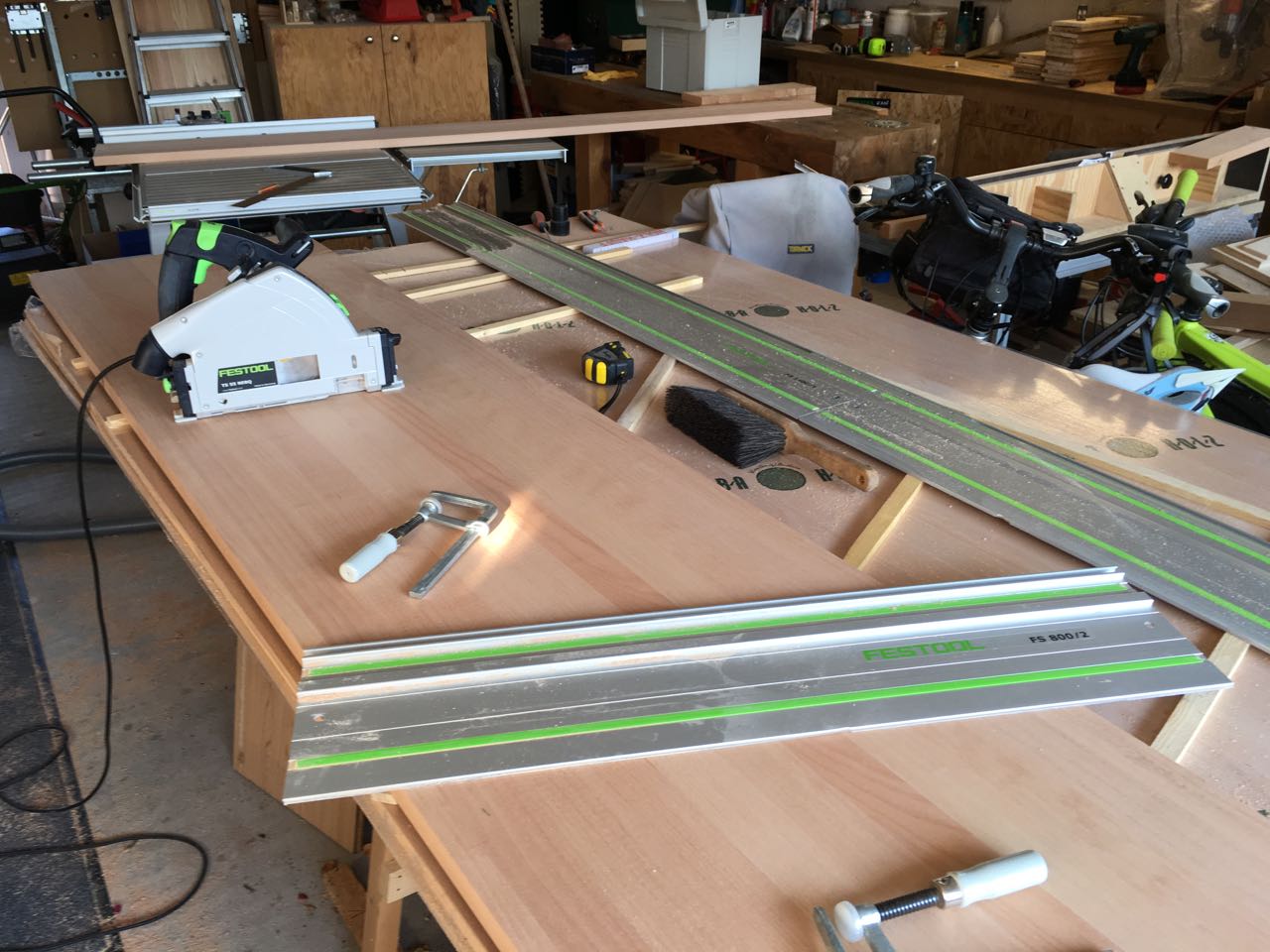 Mit zwei aneinander gesteckten 1400er Führungsschienen und meiner TS-55 Säge wurden dann die Längsschnitte der 26mm Platte für Ober- und Unterseite des TV-LowBoards ausgeführt.