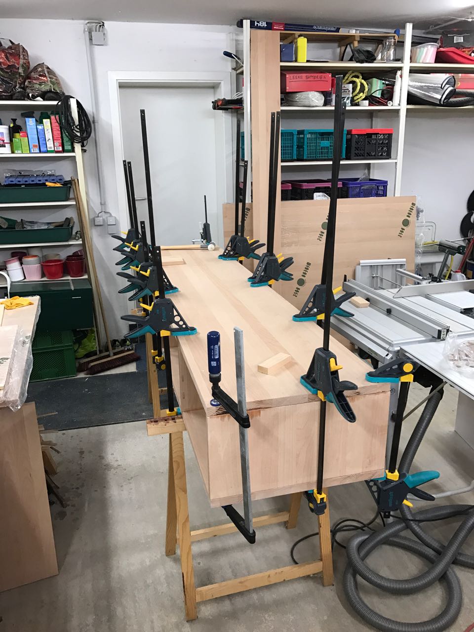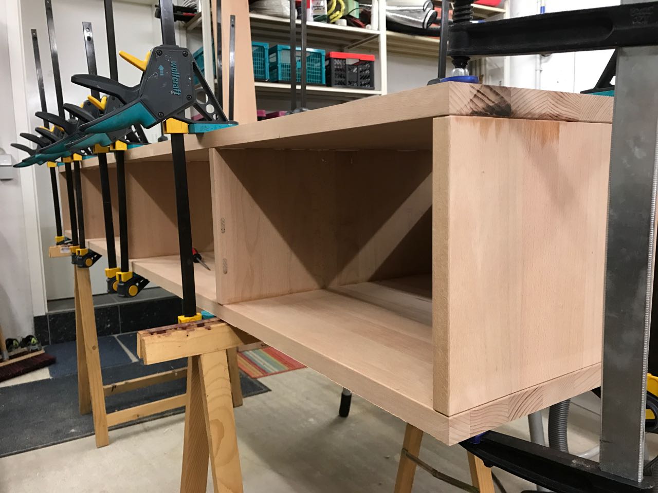 Das Verleimen des Korpus erfolgte in Etappen, die über mehrer Tage verteilt waren. Der erste Schritt war das Verleimen der beiden äußeren Baugruppen, die jeweils aus zwei 20mm starken Seitenteilen und einem 26mm starken Rückseitenteil bestehen. Mit diesen Rückseitenteilen wird das TV-LowBoard später an die Wand geschraubt werden.