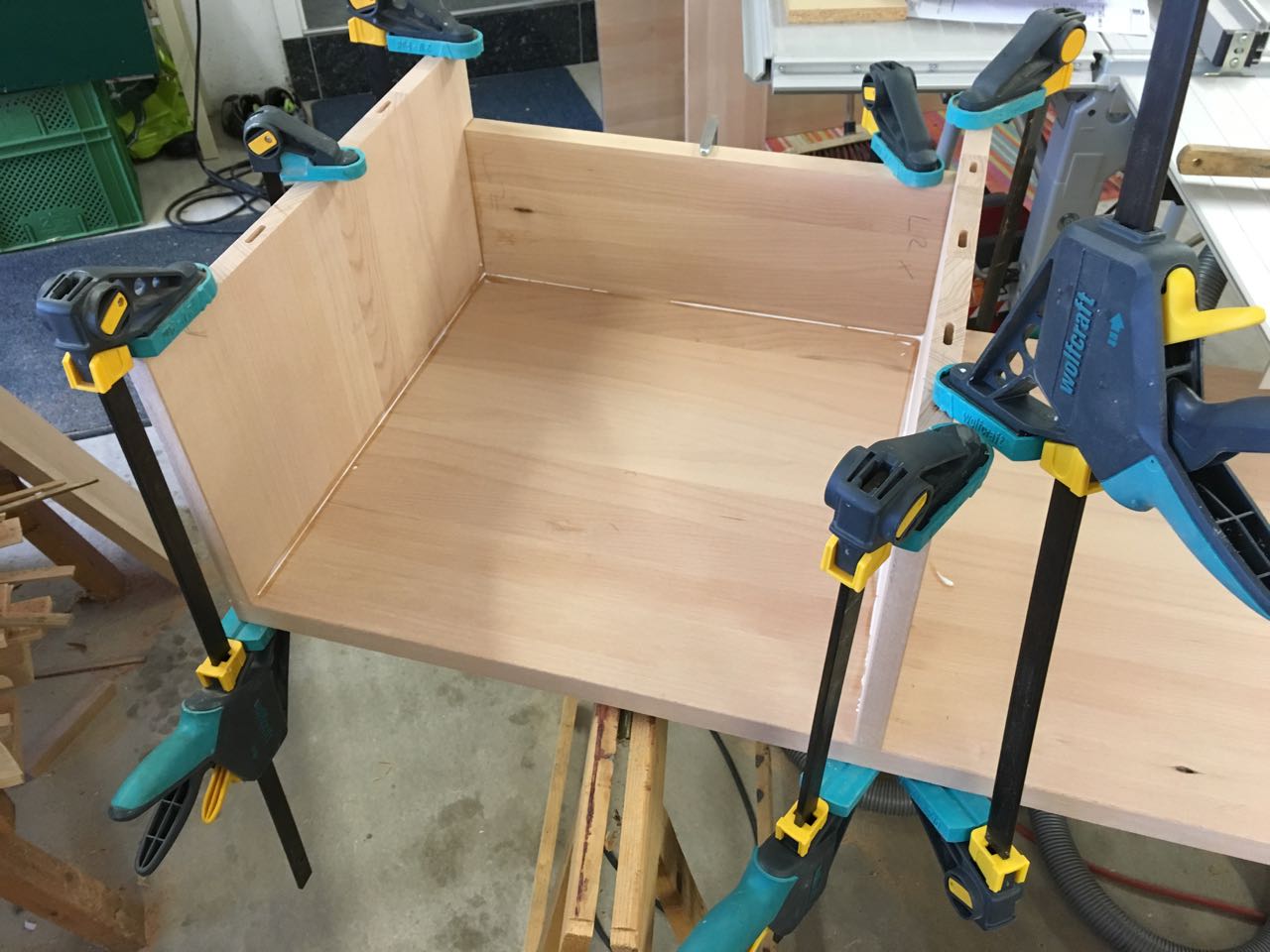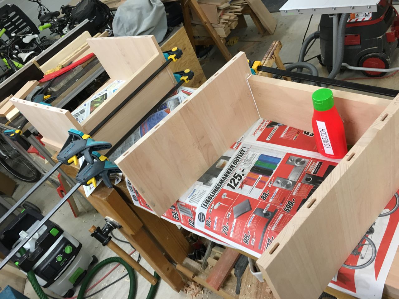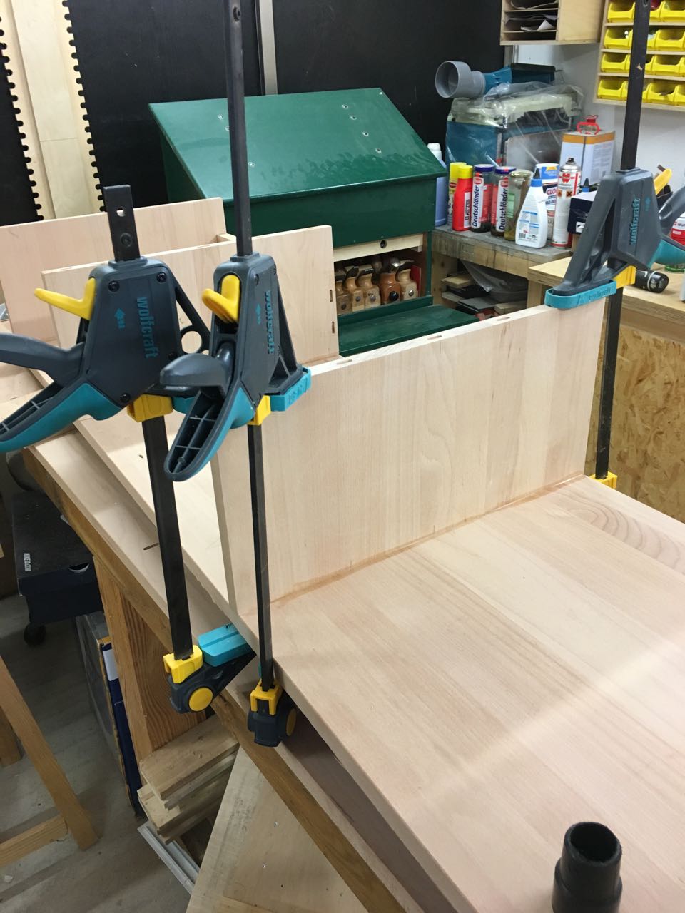 Zuerst eine Passprobe ohne Leim, danach wurde dann zur Leimflasche gegriffen. Die verleimten Teile wurden auf Winkeligkeit geprüft und dann mit den bewährten Wolfcraft-Einhandzwingen fixiert.