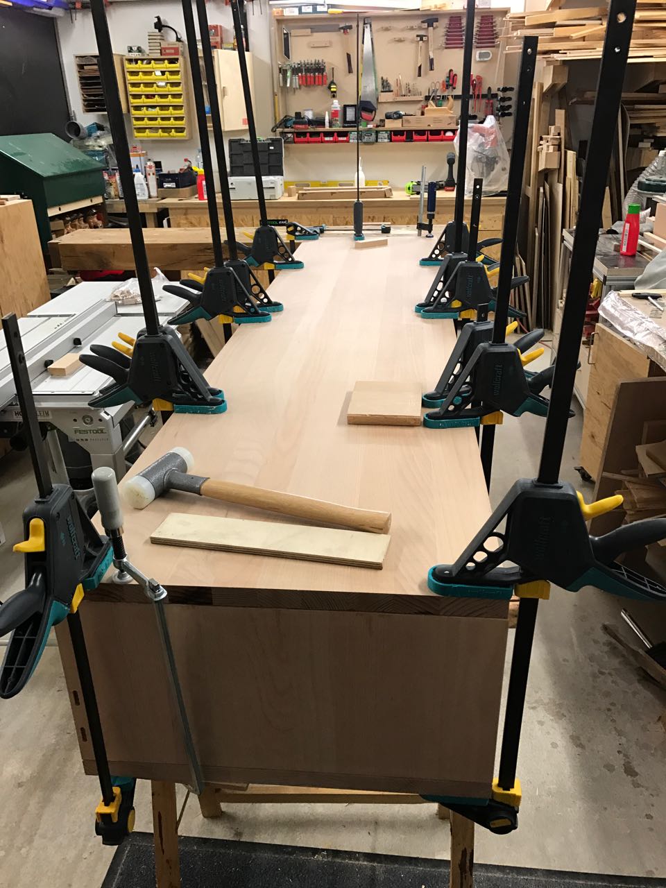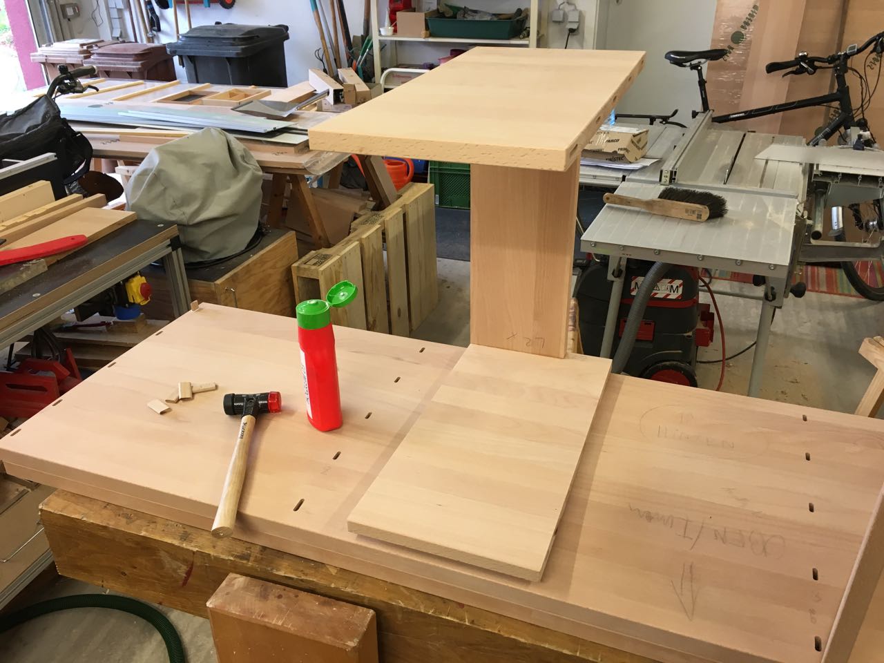An einigen Stellen war ein wenig Überzeugungsarbeit mit dem Schonhammer nötig, da die mit Weißleim bestrichenen Dominodübel bereits ein wenig aufgequollen waren. Sie passten daher nicht mehr ohne weiteres in die Schlitze.