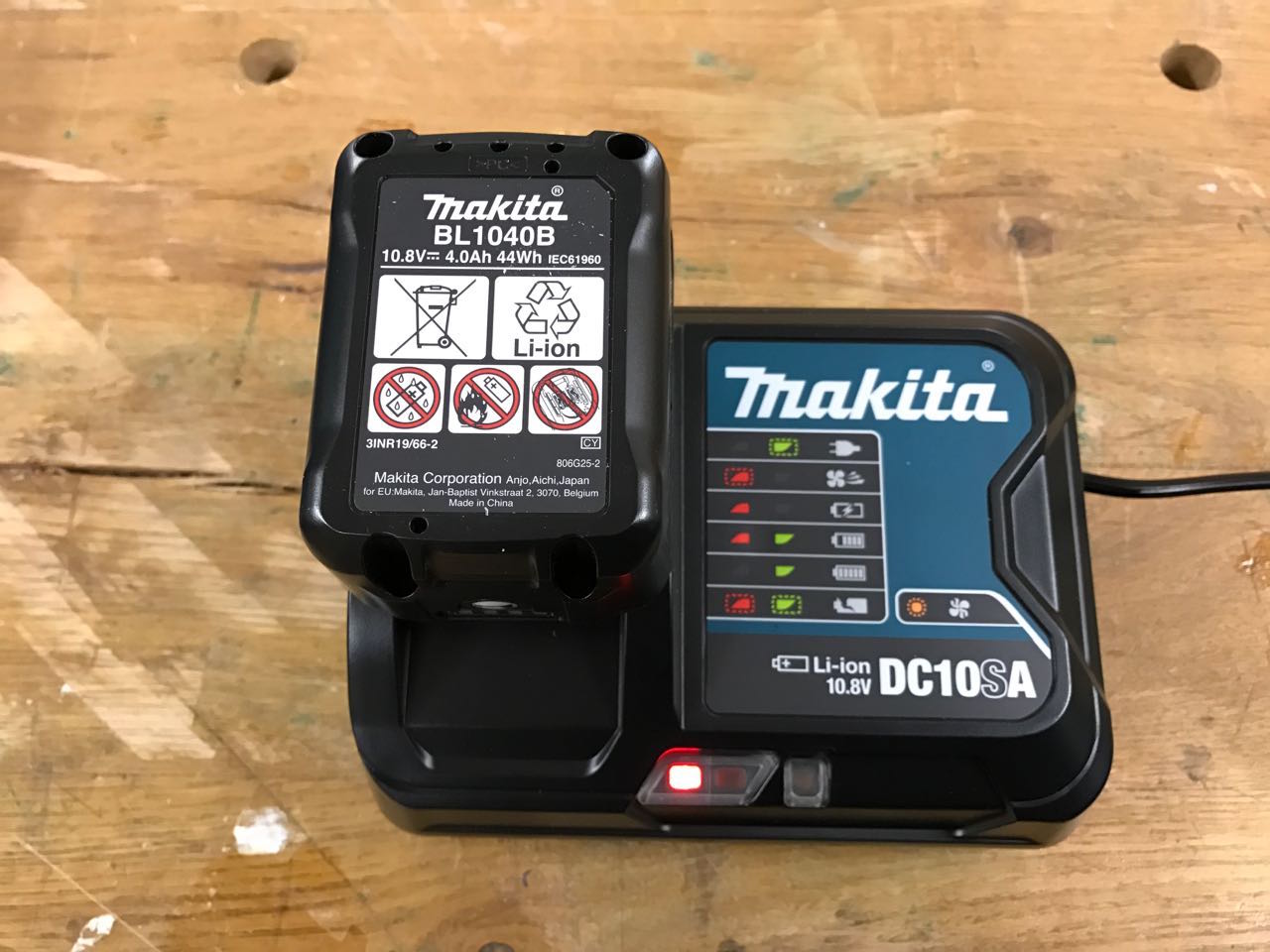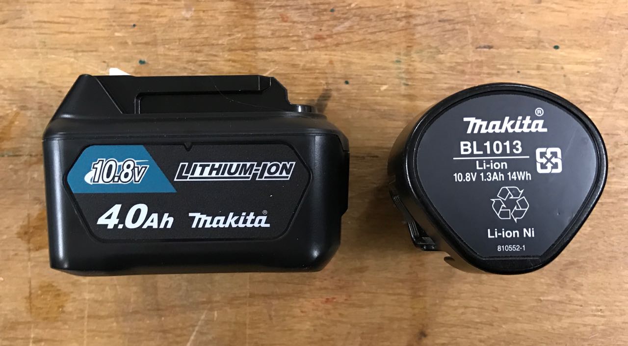 Hier links der neue Akku BL1040 mit 4Ah, rechts der alte BL1013 mit 1,3Ah. Damit wird praktisch die mehr als dreifache Akkukapazität zur Verfügung gestellt. Leider zieht damit wieder eine neue Akkutype in meine Werkstatt ein. Bisher hatte ich alle meine kleinen Makitaschrauber – wie z.B. den kleinen DA330 Winkelschrauber – mit dem einheitlichen Akku BL1013 bestücken können.