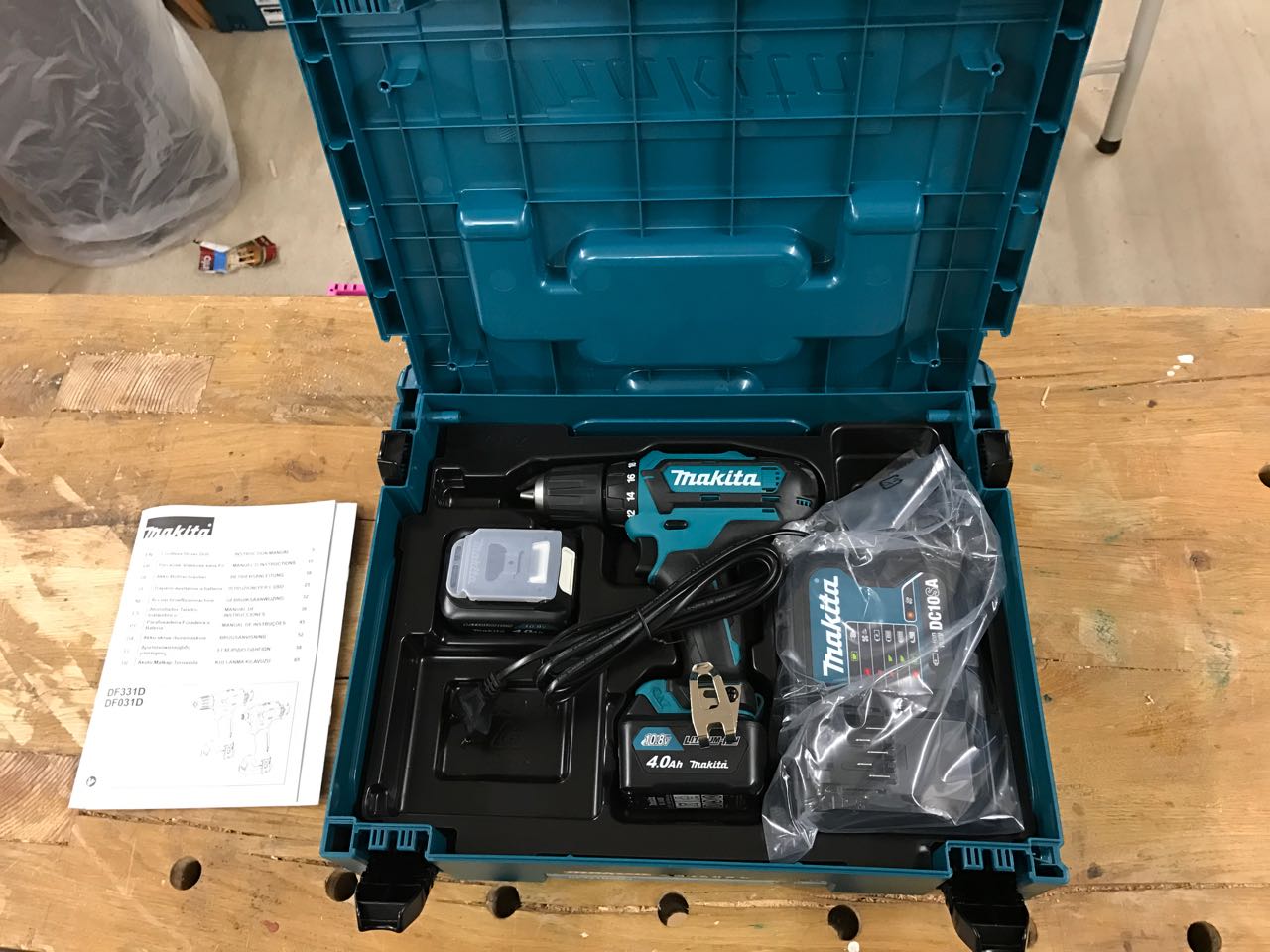 Der Akkuschrauber DF331 wurde mir in der Variante DSMJ im Makpack geliefert. Dieser enthalt neben der Maschine auch einen zweiten 4.0Ah Akku und das Ladegerät DC10SA.