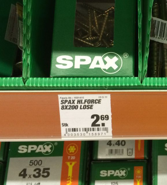 Bin begeistert von den Spax, die ich bisher nicht kannte. Es ist wie mit gutem Elektro- und Handwerkzeug – man ärgert sich, dass man nicht schon viel früher in Qualität investiert hat (ging mir nach dem Kauf meines ersten Festool-Gerätes so…). Die Spax jedenfalls sind in jeder Hinsicht das Geld wert. Ob die Auswahl im Montagekasten Holz sich für meine Arbeiten als Grundstock bewährt, wird sich zeigen.