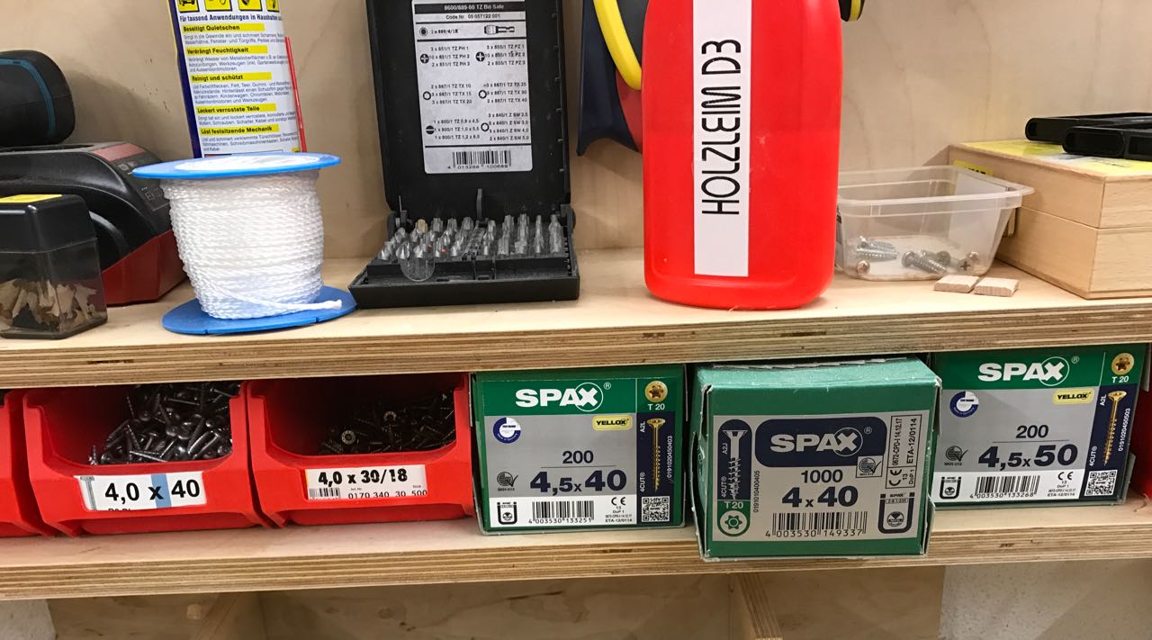 Gerade beim „Spontanwerken“ am Wochenende ist es sehr ärgerlich und demotivierend, wenn man gerade wegen ein paar simplen Schrauben nicht weiterarbeiten kann. Die Fahrt zum Baumarkt kostet viel Zeit und ist auch nur am Samstag möglich. Wer hier die gängigsten Größen zuhause hat, kann ohne Sorgen loswerkeln. Das Projekt wird zügig fertig und das motiviert!