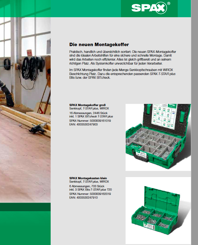 Gestern habe ich noch die Information bekommen, dass SPAX auf der Messe „BAU 2017“ in München ab dem kommenden Montag neben verschiedenen Neuheiten für 2017 unter anderem auch eine neue Serie von Montagekästen mit entsprechenden Sortimenten einführt.