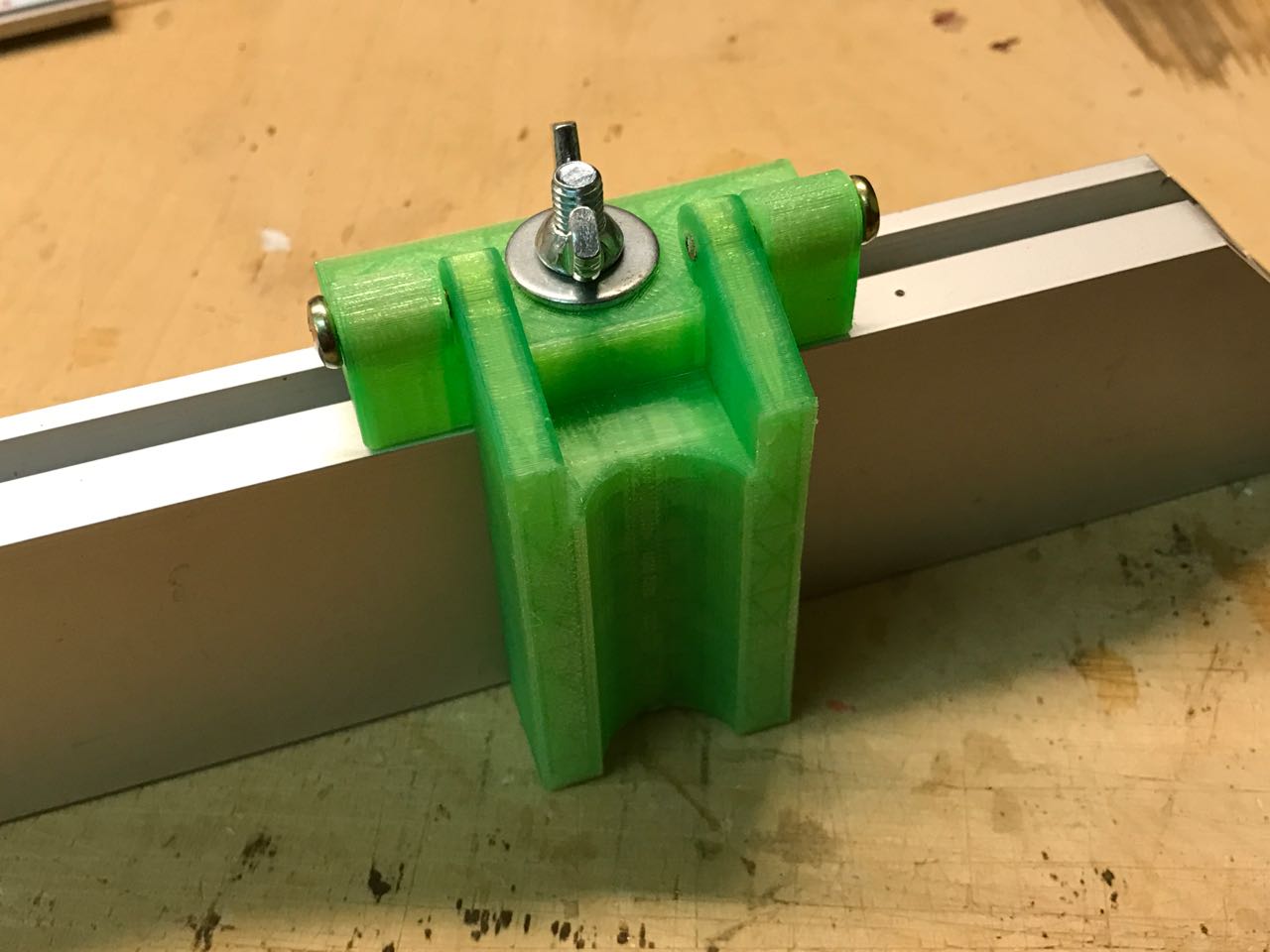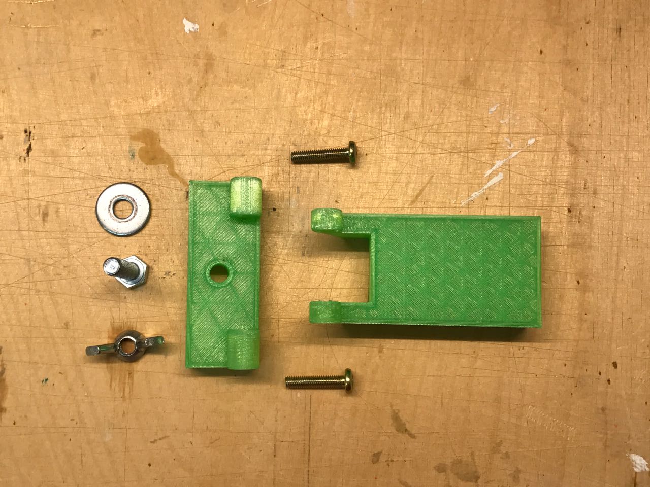 Die Bohrungen in den beiden Teilen sind dabei so ausgelegt, dass die beiden M4-Schrauben in der Klappe sich selbst ein Gewinde schneiden. Im oberen Teil für die Klemmung hingegen hat die Bohrung einen Durchmesser von 4,3mm sodass dort die Schraube beweglich bleibt.