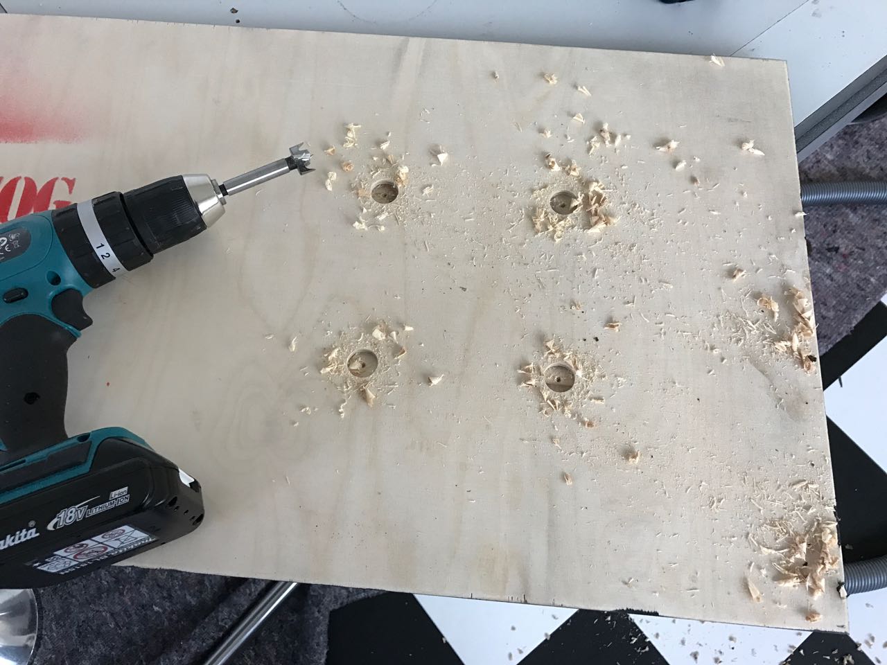 Dort wurde zuerst mit dem Forstnerbohrer vorgebohrt und anschließend mit dem 5,5mm Bohrer durchgebohrt.