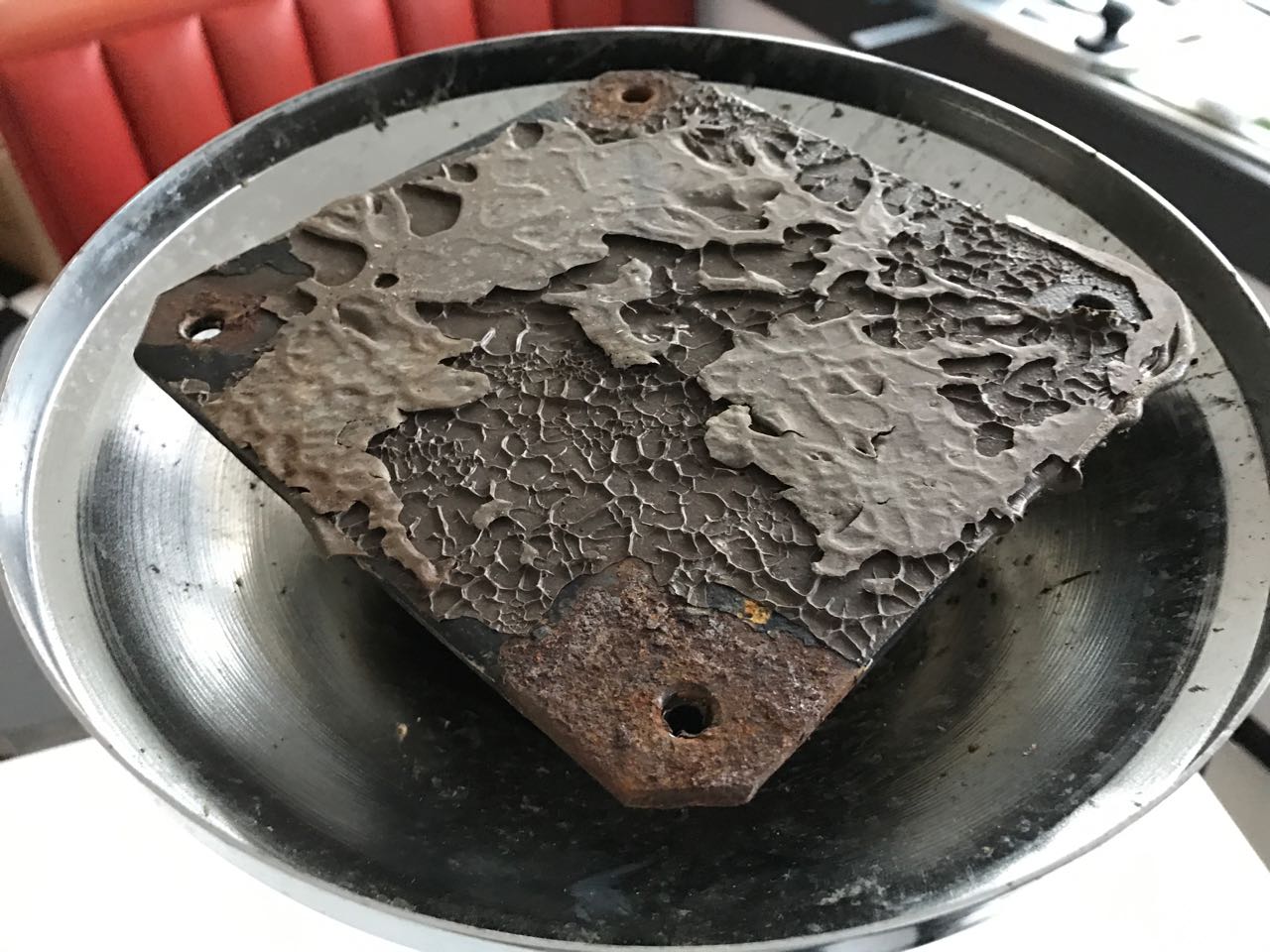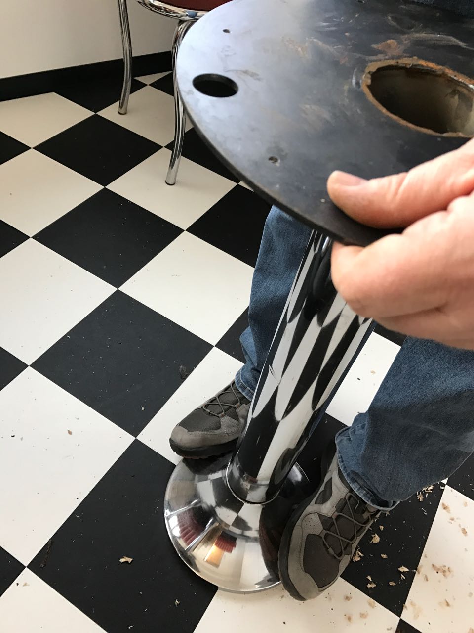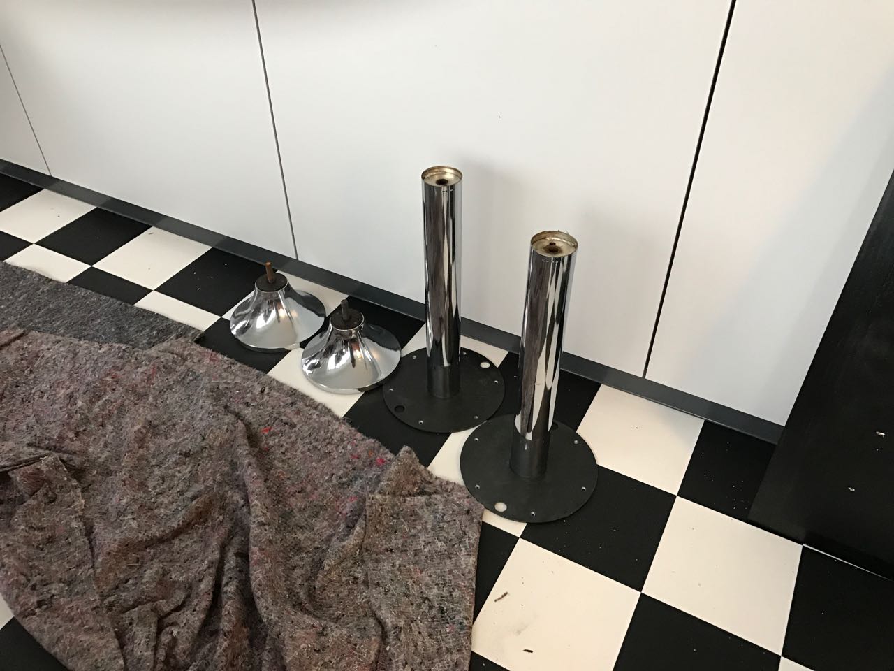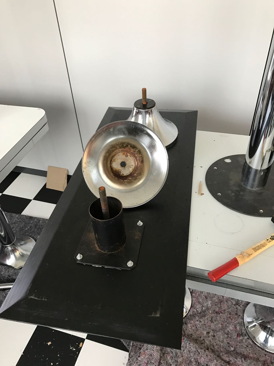 Also erst mal die Tische inspiziert und geprüft, ob die Abmessungen der Sockelplatte stimmen. Alles passte. Nun wurden die Ständer abgeschraubt und genauer inspiziert. Innen ein wenig rostig, aber sonst in gutem Zustand.