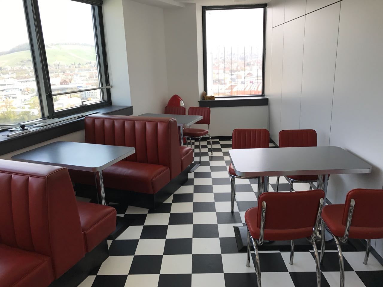 Der neue Pausenraum in unserer Firma sollte im Stil eines American Diner eingerichtet werden. Dazu haben wir entsprechendes Mobiliar bei einem Restaurant-Ausrüster preiswert erworben. Es handelt sich dabei um original amerikanische Einrichtungsteile, die auch schon im Einsatz waren. Bestellt haben wir entsprechende Sitzbänke, Stühle und Tische.