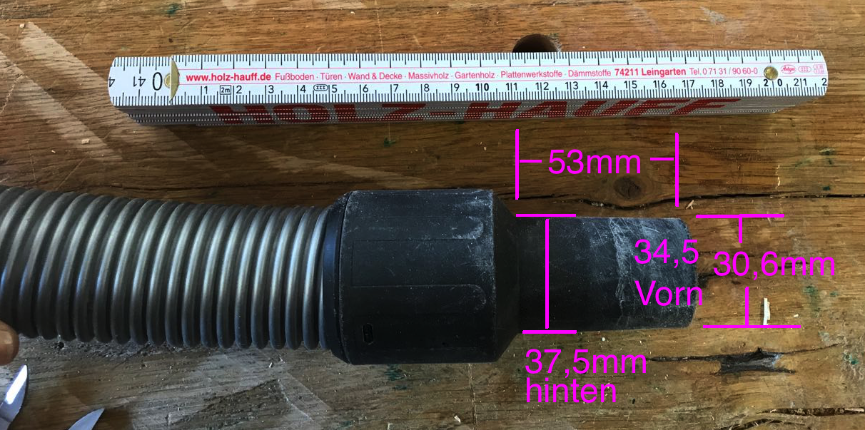Wegen verschiedenen Saugern in meinem Besitzt und einem Zyklon habe ich vor kurzem auch mal meine ganzen Schläuche und Maschinenanschlüsse vermessen. Super nervig diese ganzen unterschiedlichen Durchmesser. Auch, dass z.B. bei Festool die Nennmaße wie D50 nicht 1:1 der Wirklichkeit entsprechen.