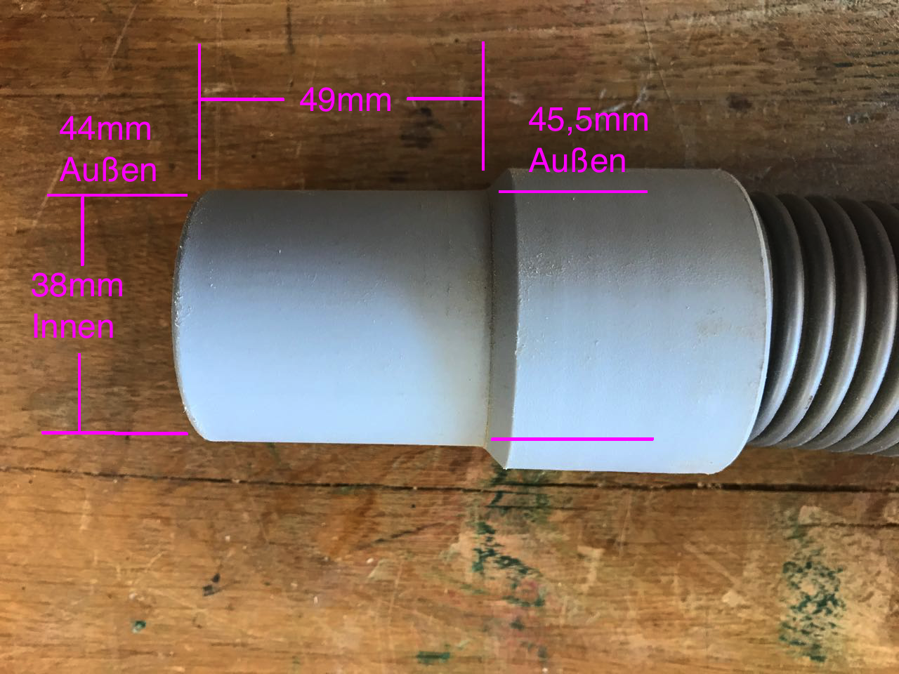 Der große 46mm Schlauch ist 2m lang und hat am Ende einen fest angeschweißten Flansch. Dieser Flansch hat einen Innendurchmesser von 38mm und einen Außendurchmesser von 44mm. Allerdings ist der Flansch leicht konisch. Daher ist der hintere, äußere Durchmesser 45,5mm.