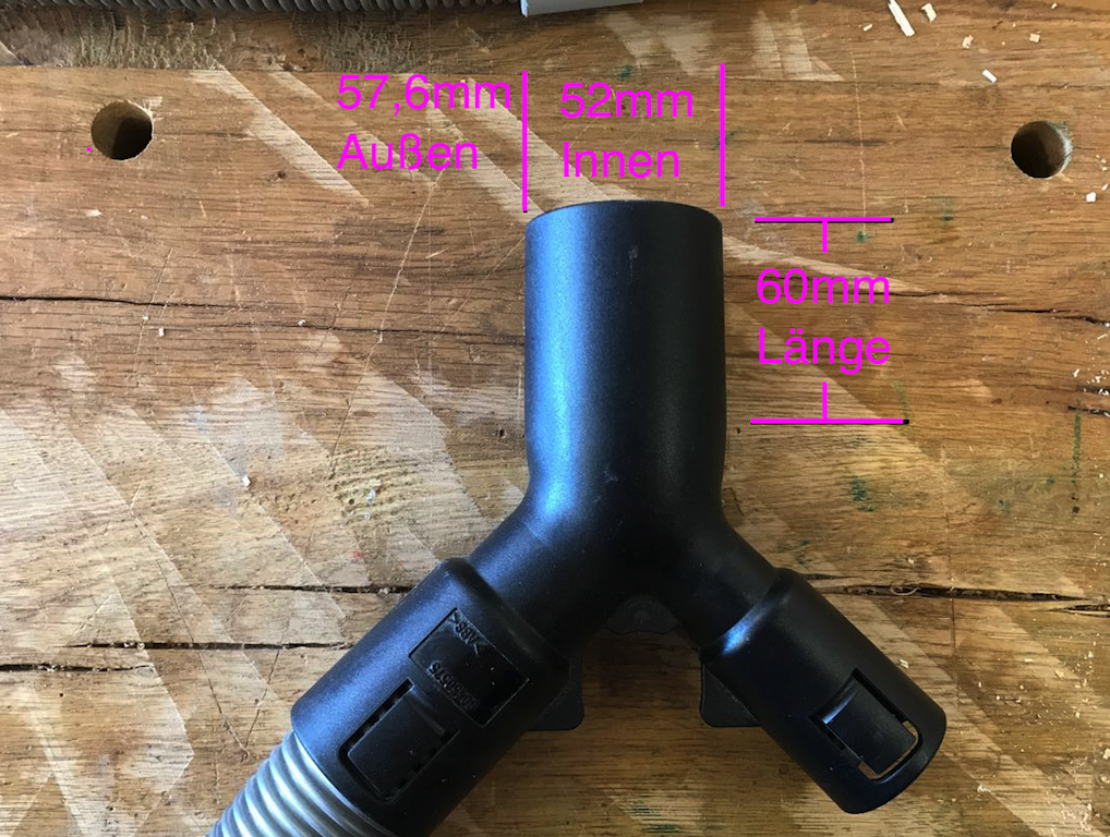 Bei der Festool CS-70 Tischkreissäge ist ein Staubsagerschlauch mit Y-Stück im Lieferumfang. Diesen Schlauch kann man auch als Ersatzteil kaufen und dann für andere Maschinen benutzen. Manfred hat mich um die Maße der Flansche gebeten, da er überlegt diesen Schlauch für seinen Frästisch benutzen, um oben und unten gleichzeitig absaugen zu können.
