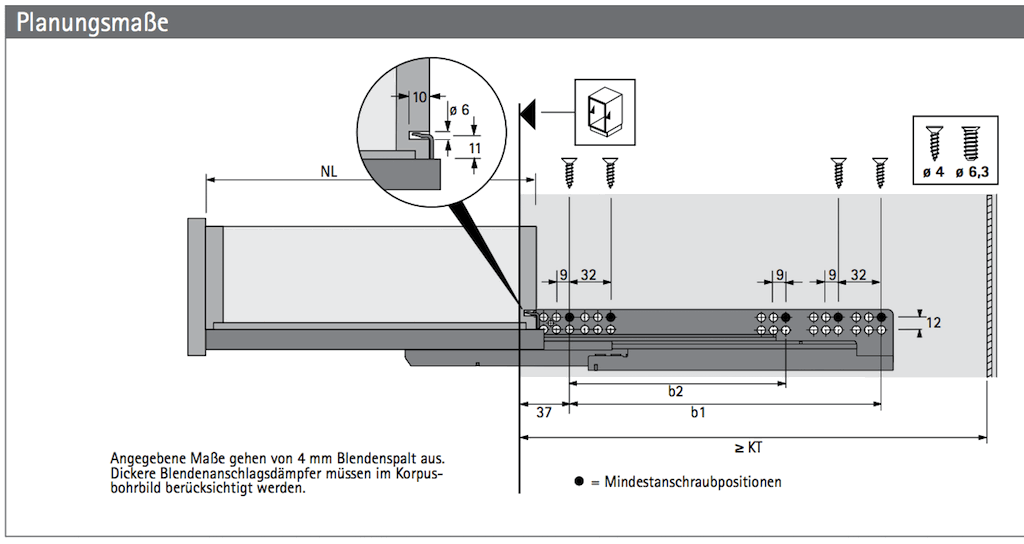 Also muß die dritte Bohrung der Schubladenführung insgesamt 37+35=72mm hinter der Front des Korpus liegen.