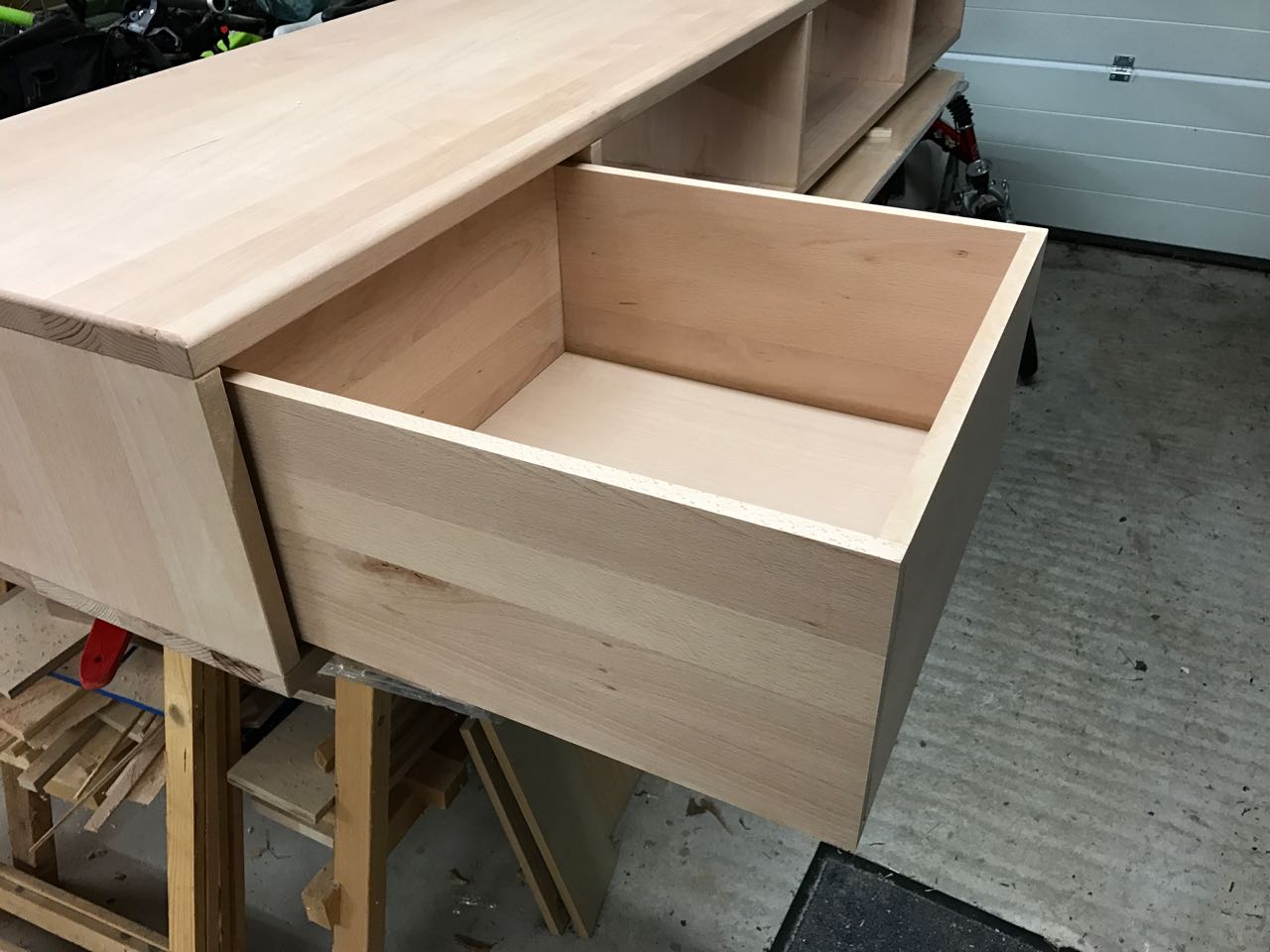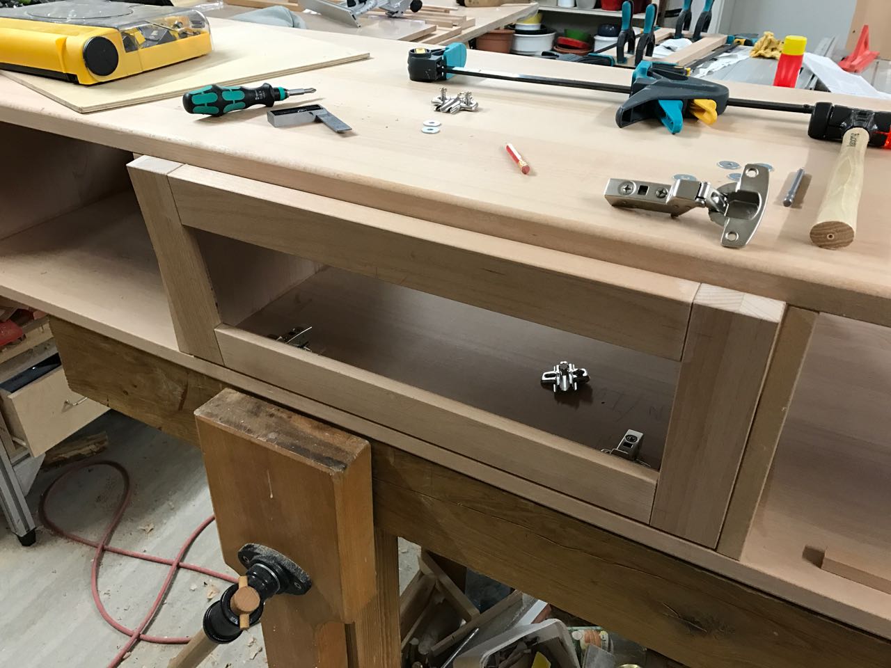 Nachdem zuletzt die beiden Schubladen gebaut wurden, steht jetzt die Montage der Schubladenführungen im Korpus des TV-Lowboards an.
